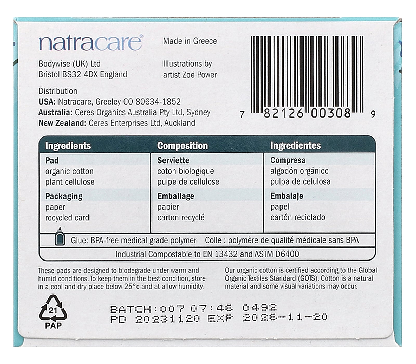 Pad: Organic cotton, plant cellulose.