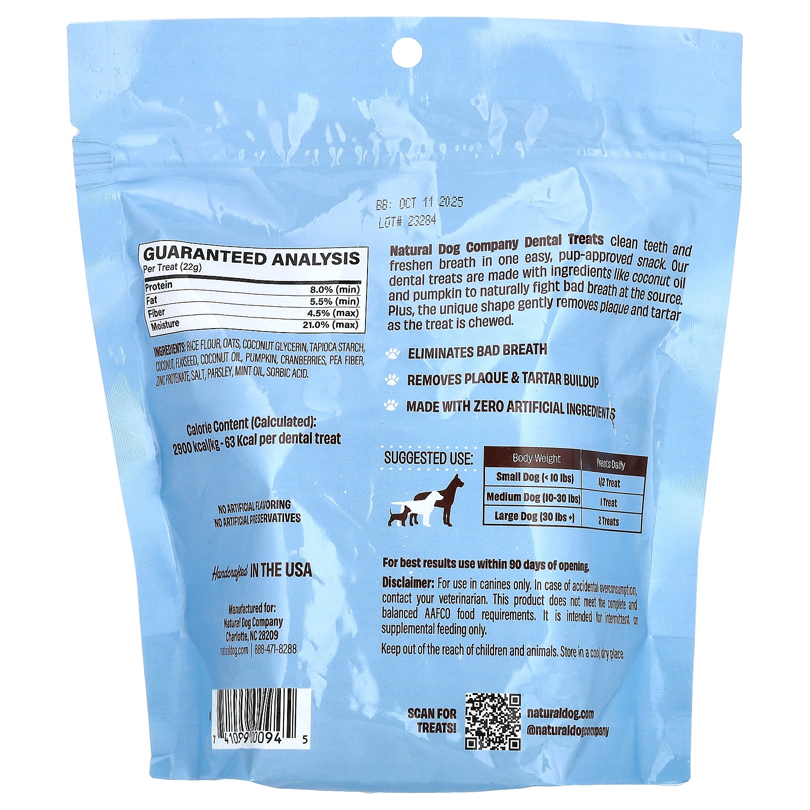 Natural Dog Company Dental Treats clean teeth and freshen breath in one easy, pup-approved snack. Our dental treats are made with ingredients like coconut oil and pumpkin to naturally fight bad breath at the source. Plus, the unique shape gently removes plaque and tartar as the treat is chewed.