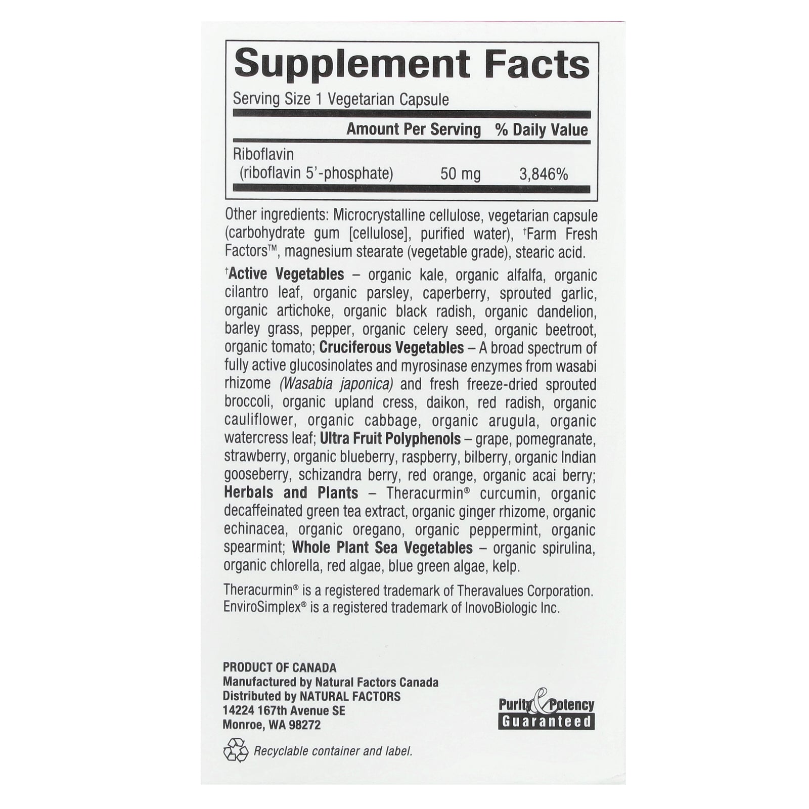 †Active Vegetables - organic kale, organic alfalfa, organic cilantro leaf, organic parsley, caperberry, sprouted garlic, organic artichoke, organic black radish, organic dandelion, barley grass, pepper, organic celery seed, organic beetroot, organic tomato; Cruciferous Vegetables - A broad spectrum of full active glucosinolates and myrosinase enzymes from wasabi rhizome (Wasabia japonica) and fresh freeze-dried sprouted broccoli, organic upland cress, daikon, red radish, organic cauliflower, organic cabbage, organic arugula, organic watercress leaf: Ultra Fruit Polyphenols - grape, pomegranate, strawberry, organic blueberry, raspberry, bilberry, organic indian gooseberry, schizandra berry, red orange, organic acai berry; Herbals and Plants - Theracurmin® curcumin, organic decaffeinated green tea extract, organic ginger rhizome, organic echinacea, organic oregano, organic peppermint, organic spearmint; Whole Plant Sea Vegetables - organic spirulina, organic chlorella, red algae, blue green algae, kelp.