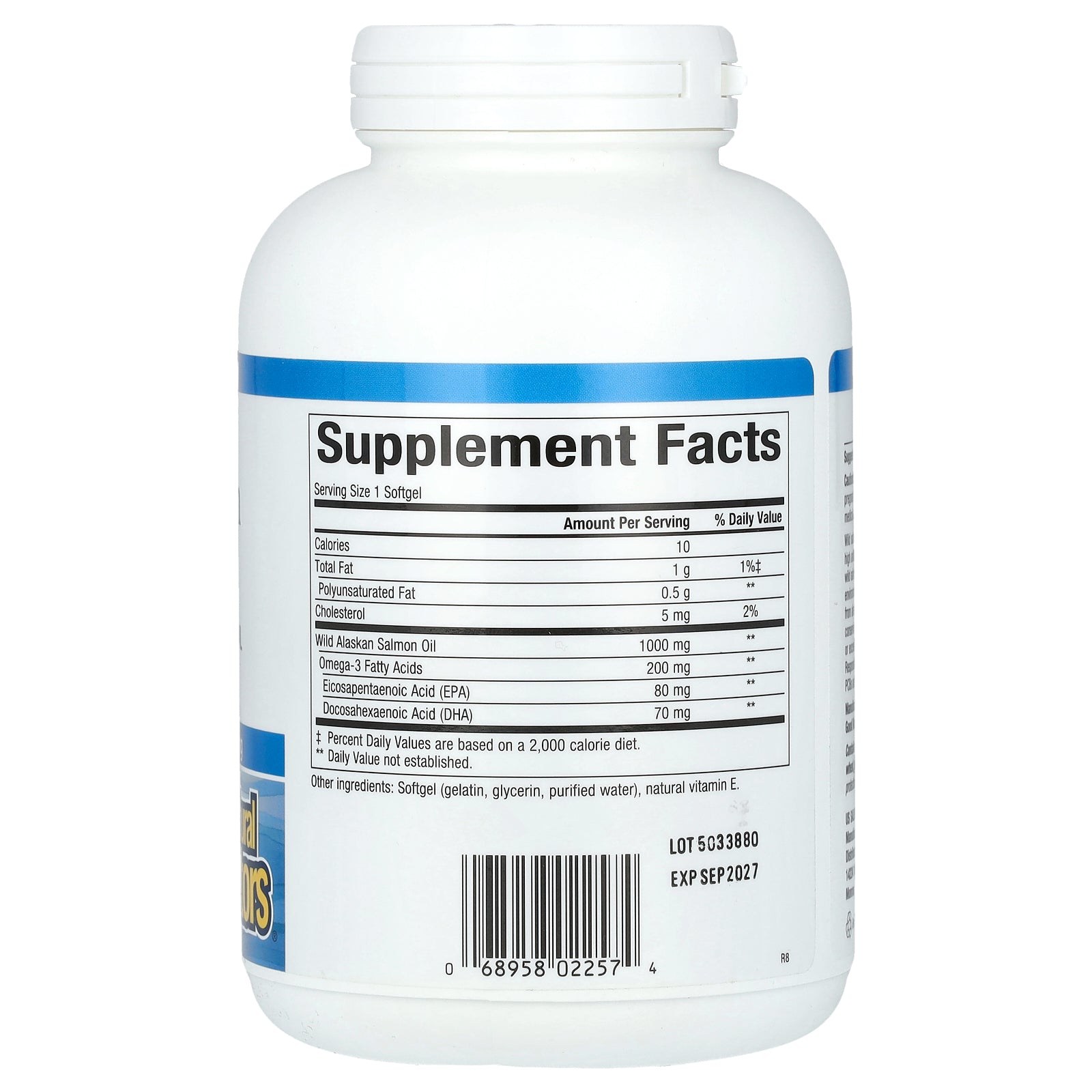 Wild salmon is a healthier choice than farmed salmon, which has been found to contain high antibiotic, PCB and dioxin levels. A source of omega-3 fatty acids and astaxanthin, wild salmon oil has a naturally occurring ratio of EPA to DHA. Wild salmon may be a better environmental choice because salmon farms can pollute coastal waters. The oil is extracted from already harvested salmon, using fish parts that would otherwise be wasted, thereby conserving existing stocks. Rigorously tested for purity, this product is guaranteed to meet or exceed the quality standards set forth by the Canadian government and the Council for Responsible Nutrition for environmental pollutants such as heavy metals, pesticides, dioxins, PCBs and other harmful compounds.