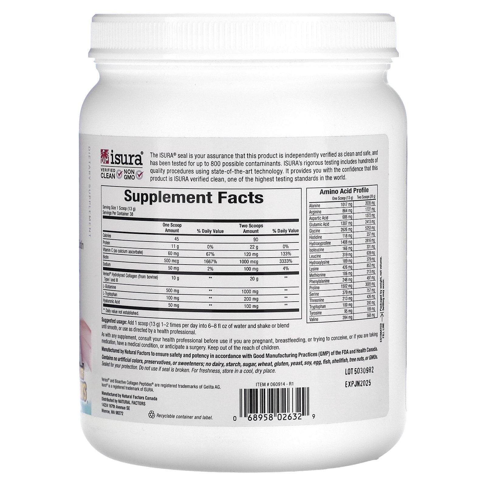 20 g Collagen + 100 mg Hyaluronic Acid) + (200 mg L-tryptophan + 1,000 mg L-glutamine + 120 mg Vitamin C + 1,000 mcg Biotin Per 2 Scoops