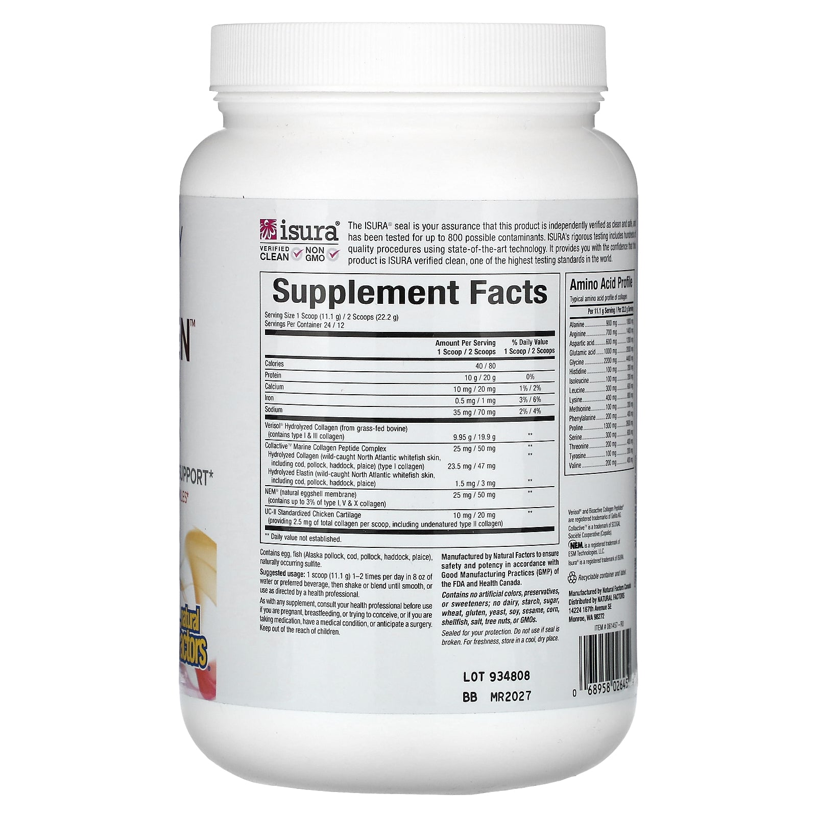 Each two-scoop serving provides clinically supported ingredients, including 20 g of grass-fed, pasture-raised Verisol bovine collagen, Collactive marine collagen from wild-caught whitefish, NEM, and UC-II.