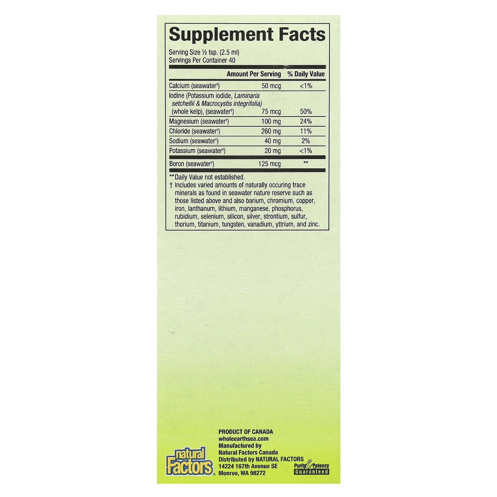 | **Daily Value not established. †Includes varied amounts of naturally occurring trace minerals as found in seawater nature reserve such as those listed above and also barium, chromium, copper, iron, lanthanum, lithium, manganese, phosphorus, rubidium, selenium, silicon, silver, strontium, sulfur, thorium, titanium, tungsten, vanadium, yttrium, and zinc. | ||