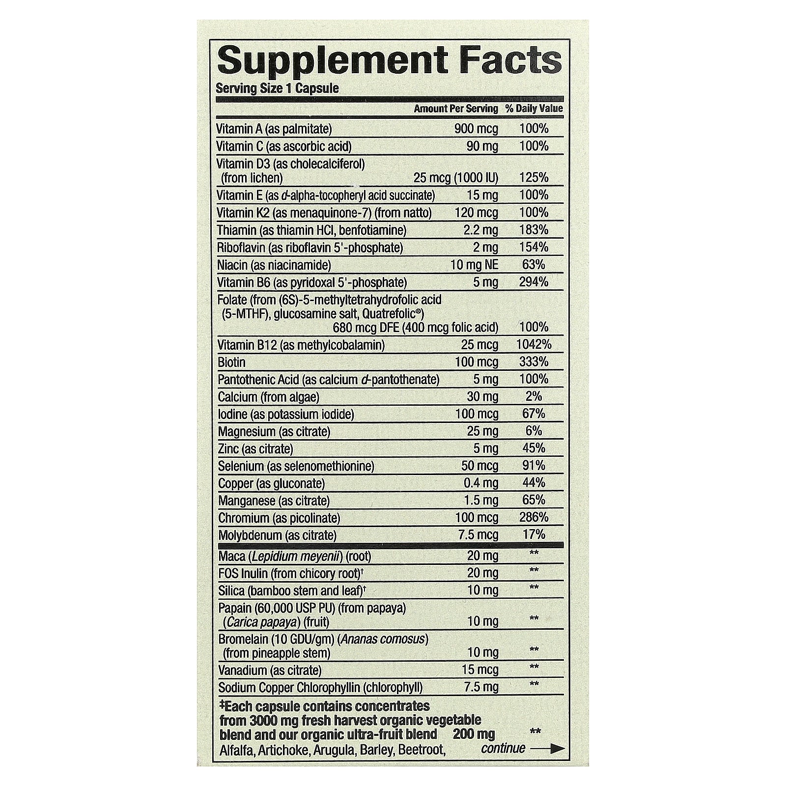‡Each capsule contains concentrates from 3000 mg fresh harvest organic vegetable blend and or organic ultra-fruit blend Alfalfa, Artichoke, Arugula, Barley, Beetroot, Broccoli, Cabbage, Cauliflower, Celery, Cilantro, Kale, Parsley, Chili Pepper, Radish, Tomato, Watercress, Carrot, Basil, Chard, Dandelion, Calendula, Acai, Bilberry, Blueberry, Cranberry, Apple, Raspberry, Strawberry |