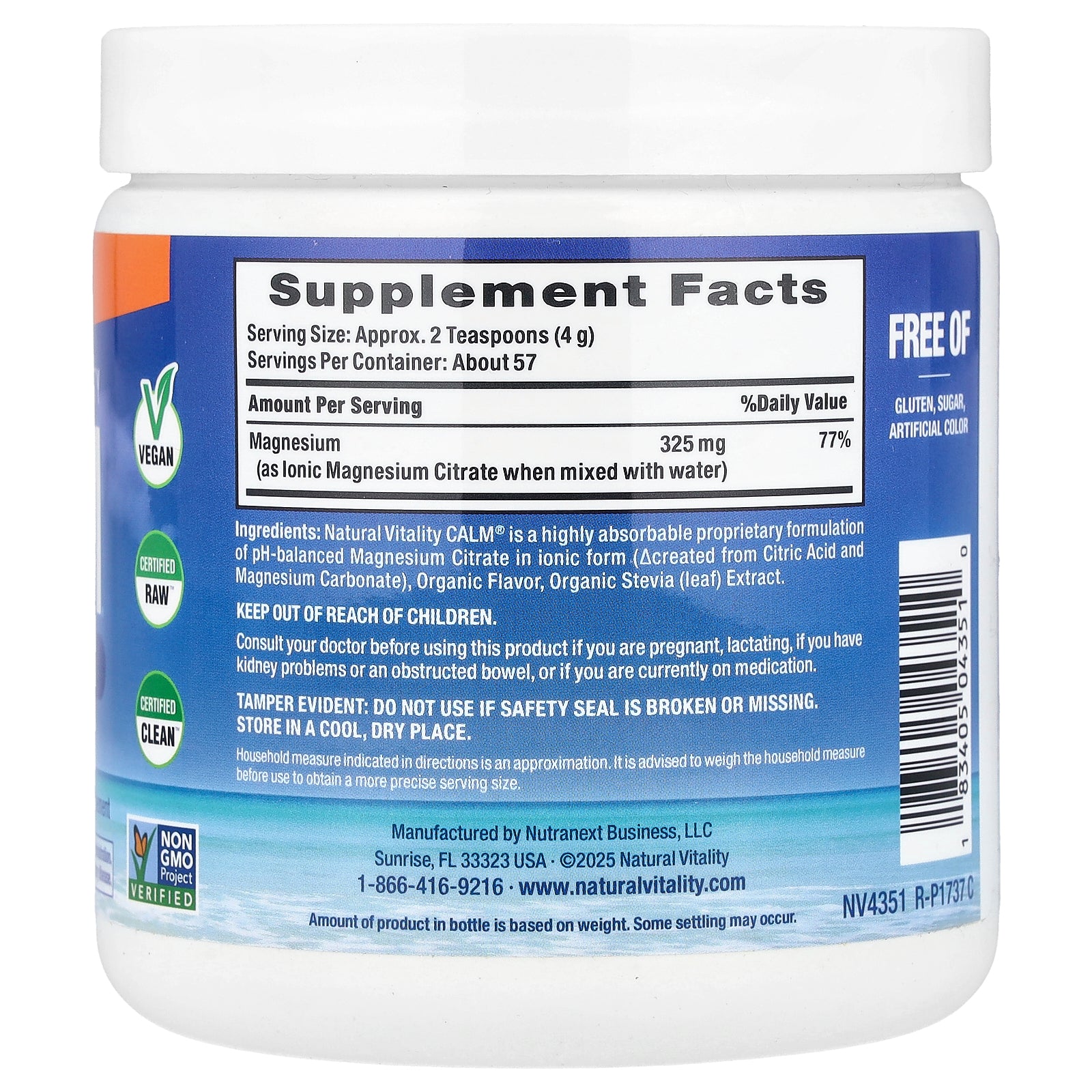 Natural Vitality CALM® is a highly absorbable proprietary formulation of PH-balanced Magnesium Citrate in ionic form (△created from citric acid and magnesium carbonate), organic flavor, organic stevia (leaf) extract.