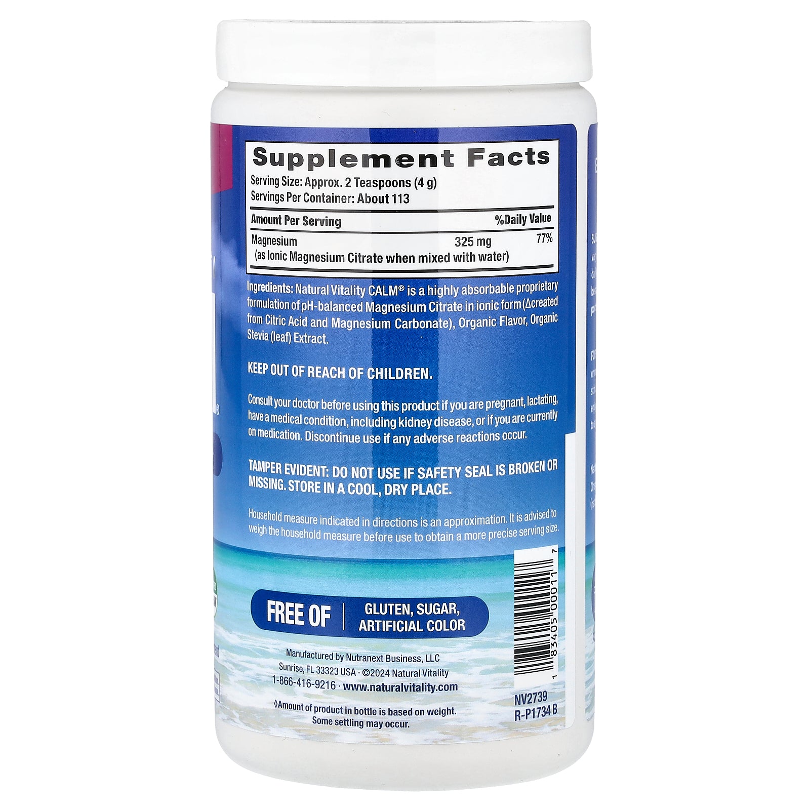Natural Vitality CALM® is a highly absorbable proprietary formulation of pH-balanced Magnesium Citrate in ionic form (△created from citric acid and magnesium carbonate), organic flavor, organic stevia (leaf) extract.