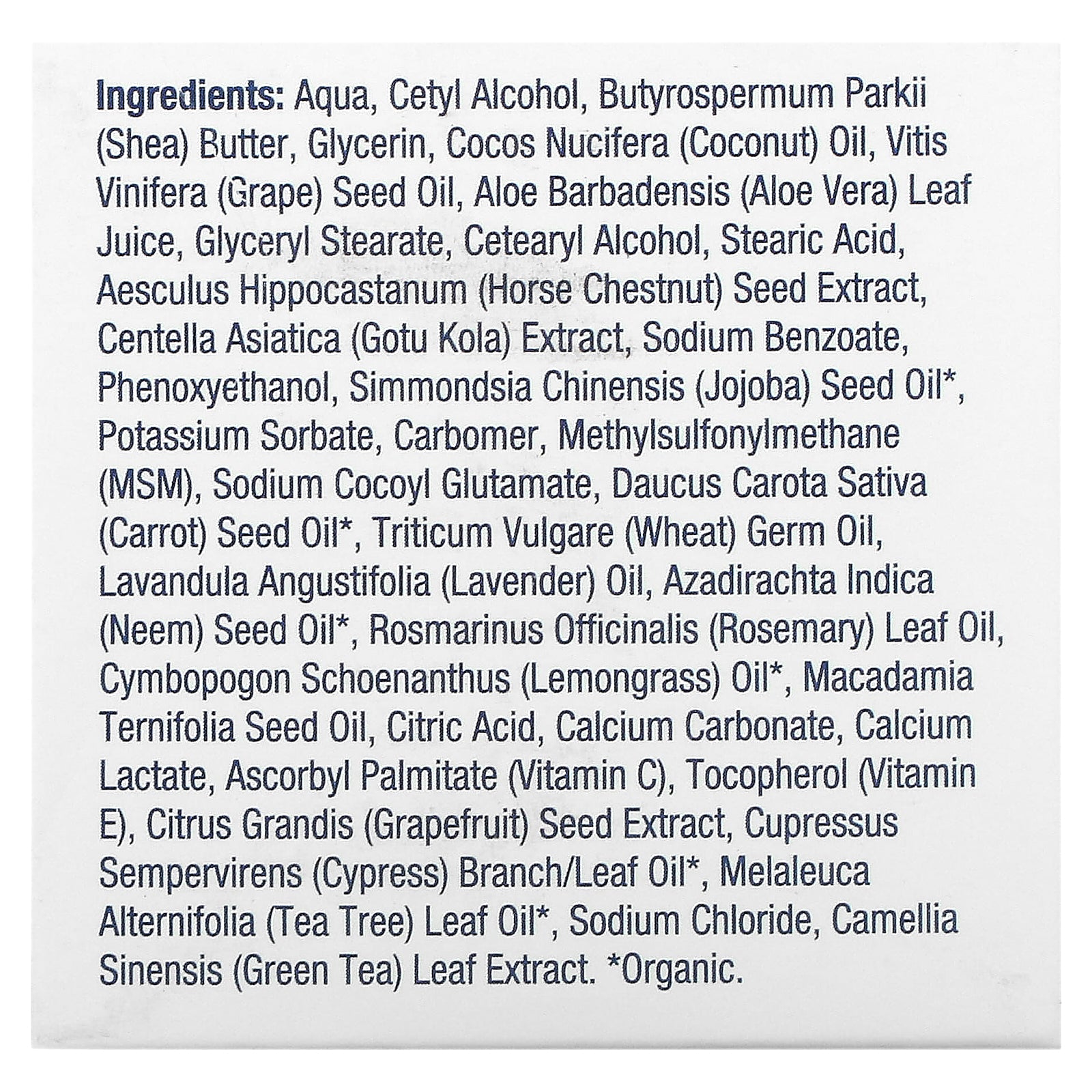 Aqua, cetyl alcohol, butyrospermum parkii (shea) butter, glycerin, cocos nucifera (coconut) oil, vitis vinifera (grape) seed oil, aloe barbadensis (aloe vera) leaf juice, glyceryl stearate, cetearyl alcohol, stearic acid, aesculus hippocastanum (horse chestnut) seed extract, centella asiatica (gotu kola) extract, sodium benzoate, phenoxyethanol, simmondsia chinensis (jojoba) seed oil*, potassium sorbate, carbomer, methylsulfonylmethane (msm), sodium cocoyl glutamate, daucus carota sativa (carrot) seed oil*, triticum vulgare (wheat) germ oil, lavandula angustifolia (lavender) oil, azadirachta indica (neem) seed oil*, rosmarinus officinalis (rosemary) leaf oil, cymbopogon schoenanthus (lemongrass) oil*, macadamia ternifolia seed oil, citric acid, calcium carbonate, calcium lactate, ascorbyl palmitate (vitamin C), tocopherol (vitamin E), citrus grandis (grapefruit) seed extract, cupressus sempervirens (cypress) branch/leaf oil*, melaleuca alternifolia (tea tree) leaf oil*, sodium chloride, camellia sinensis (green tea) leaf extract.