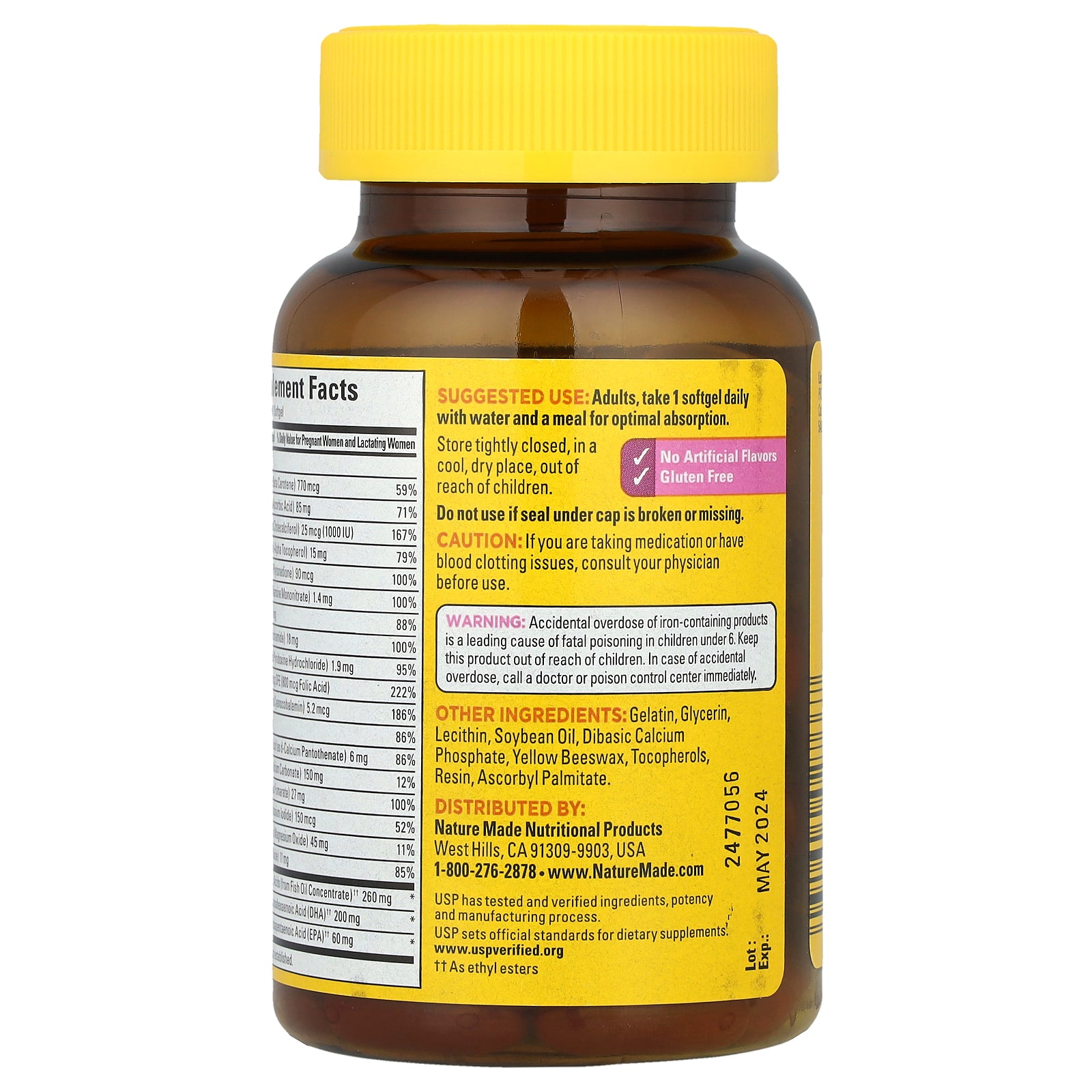 Adding a prenatal multivitamin to your morning routine can help support your nutritional needs plus the growth of your developing baby. Nature Made Prenatal Folic Acid + DHA Softgels are specially formulated to support the development of baby's brain, nervous system, bones and eyes.