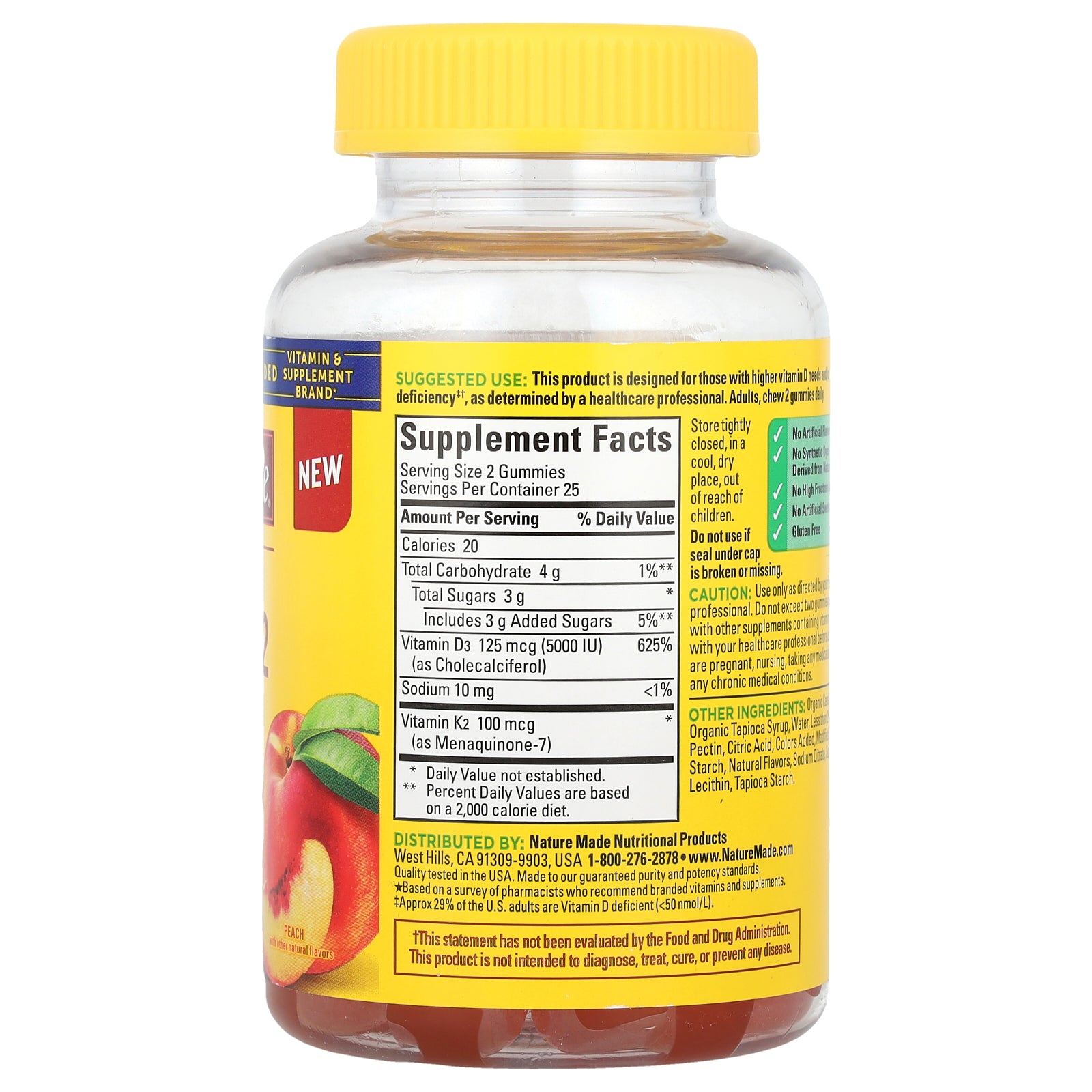 Vitamin D3 + K2 Gummies are a delicious way to support strong, healthy bones. Vitamin D3 and K2 work better for bone health when taken together than D3 alone and adding K2 to Vitamin D3 helps direct Calcium to bones. Get a great vitamin partnership in two daily Peach-flavored gummies.