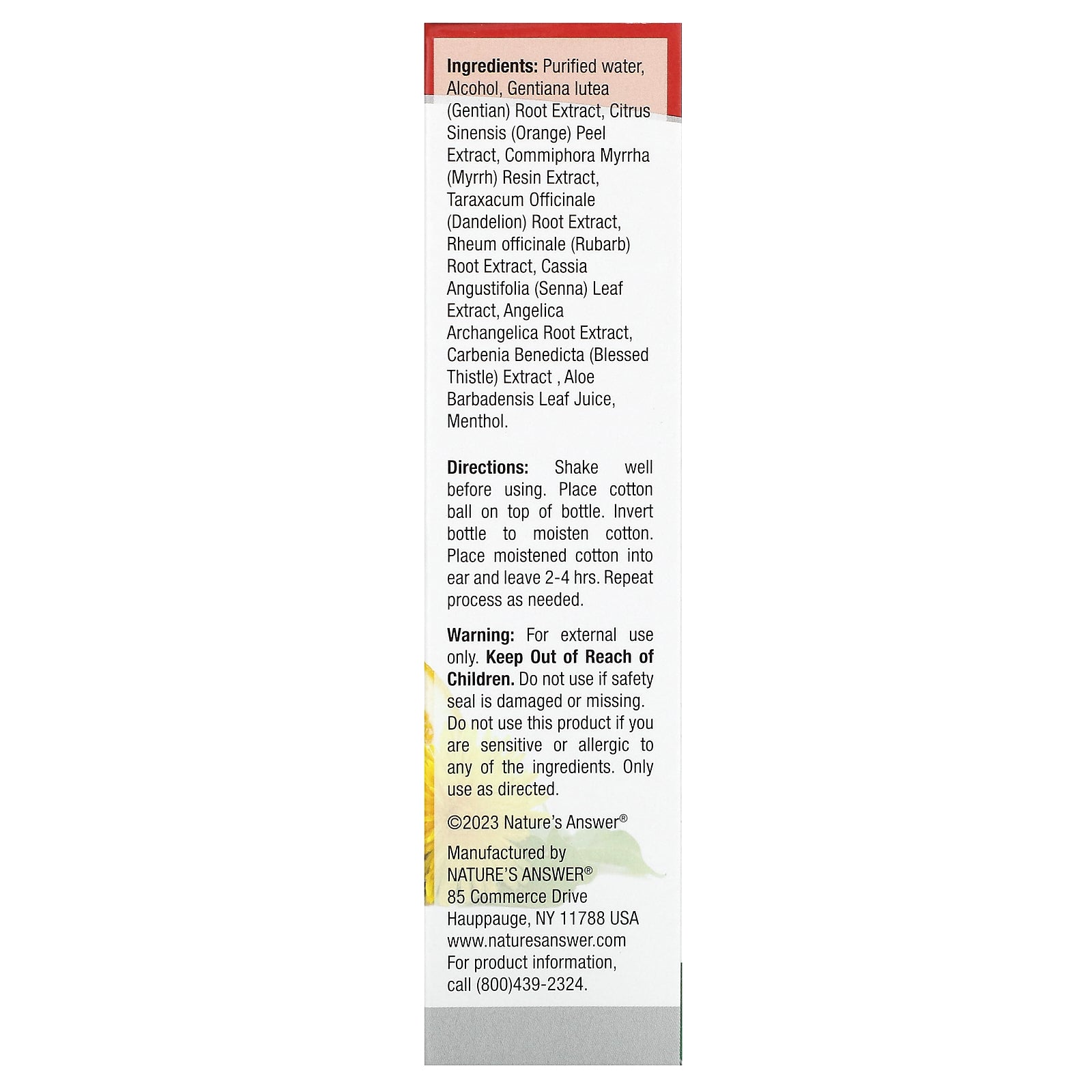 Purified water, alcohol, gentiana lutea (gentian) root extract, citrus sinensis (orange) peel extract, commiphora myrrha (myrrh) resin extract, taraxacum officinale (dandelion) root extract, rheum officinale (rubarb) root extract, cassia angustifolia (senna) leaf extract, angelica archangelica root extract, carbenia benedicta (blessed thistle) extract, aloe barbadensis leaf juice, menthol.