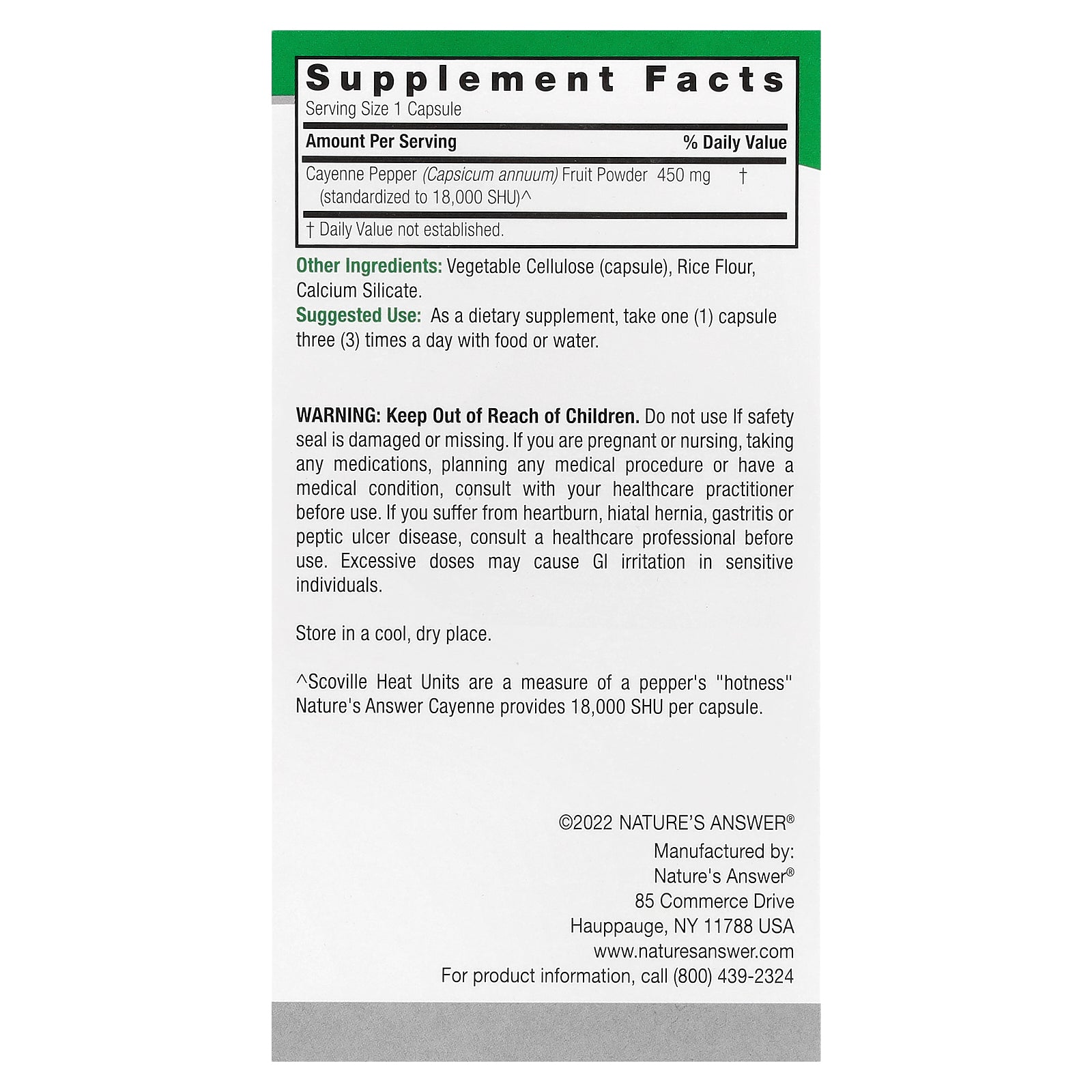 | † Daily Value (DV) not established ^ Scoville Heat Units are a measure of a pepper's "hotness". Nature's Answer Cayenne provides 18,000 SHU per capsule. | ||