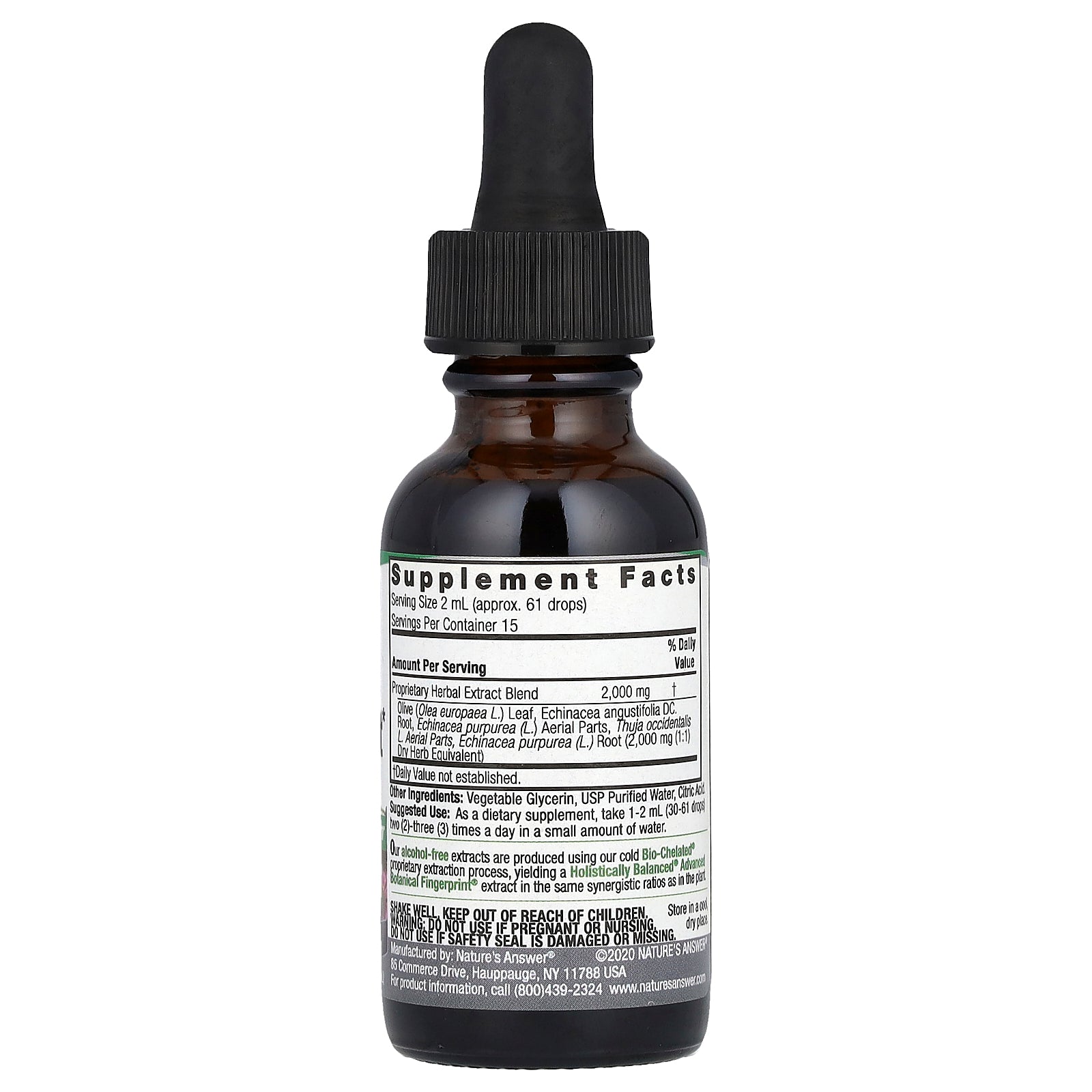 | Proprietary Herbal Extract blend: Olive (Olea europaea L.) Leaf, Echinacea angustifolia DC. Root, Echinacea purpurea (L.) Aerial Parts, Thuja occidentalis L. Aerial Parts, Echinacea purpurea (L.) Root (2,000 mg (1:1) Dry Herb Equivalent) |