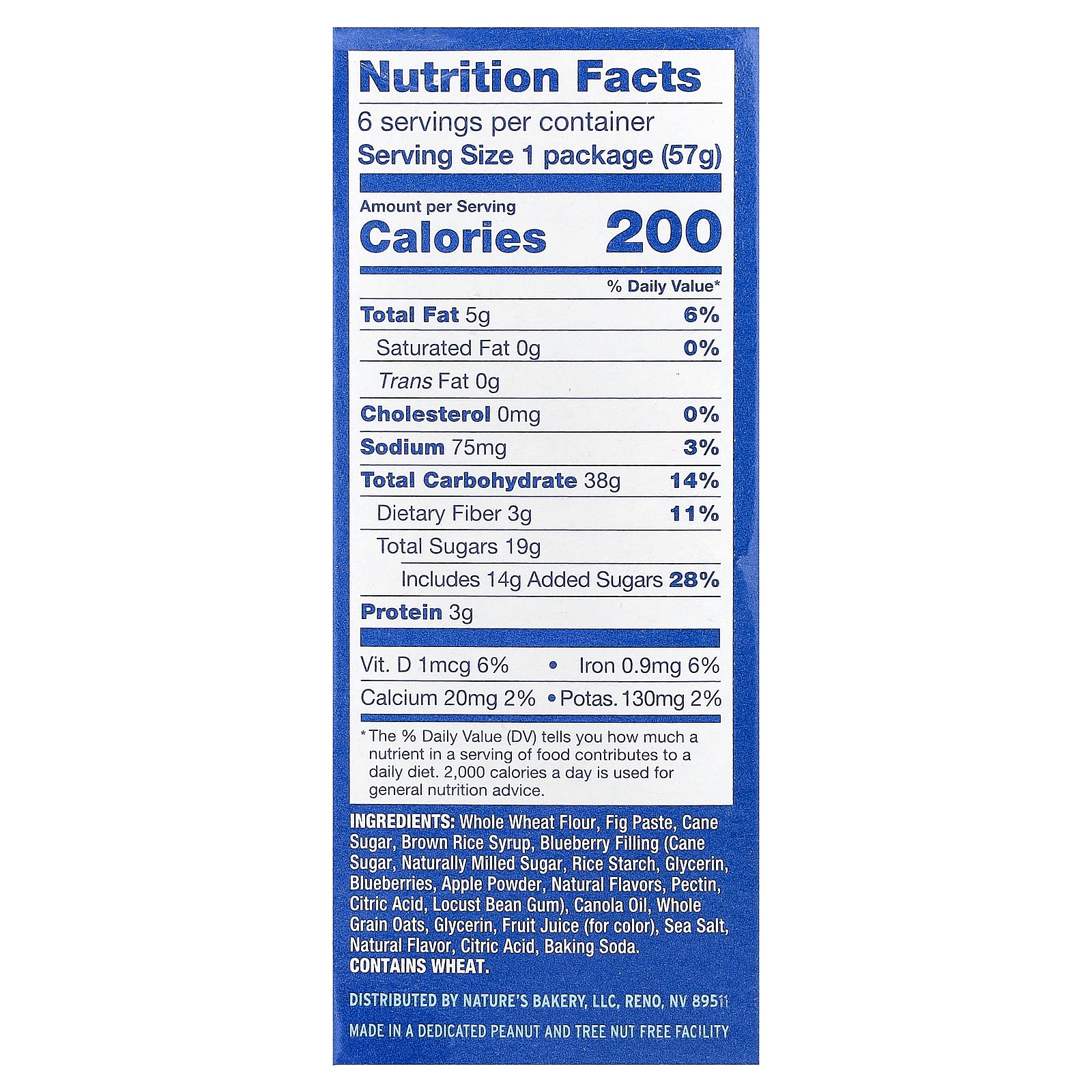Whole wheat flour, fig paste, cane sugar, brown rice syrup, blueberry filling (cane sugar, naturally milled sugar, rice starch, glycerin, blueberries, apple powder, natural flavors, pectin, citric acid, locust bean gum), canola oil, whole grain oats, glycerin, fruit juice (for color), sea salt, natural flavor, citric acid, baking soda.