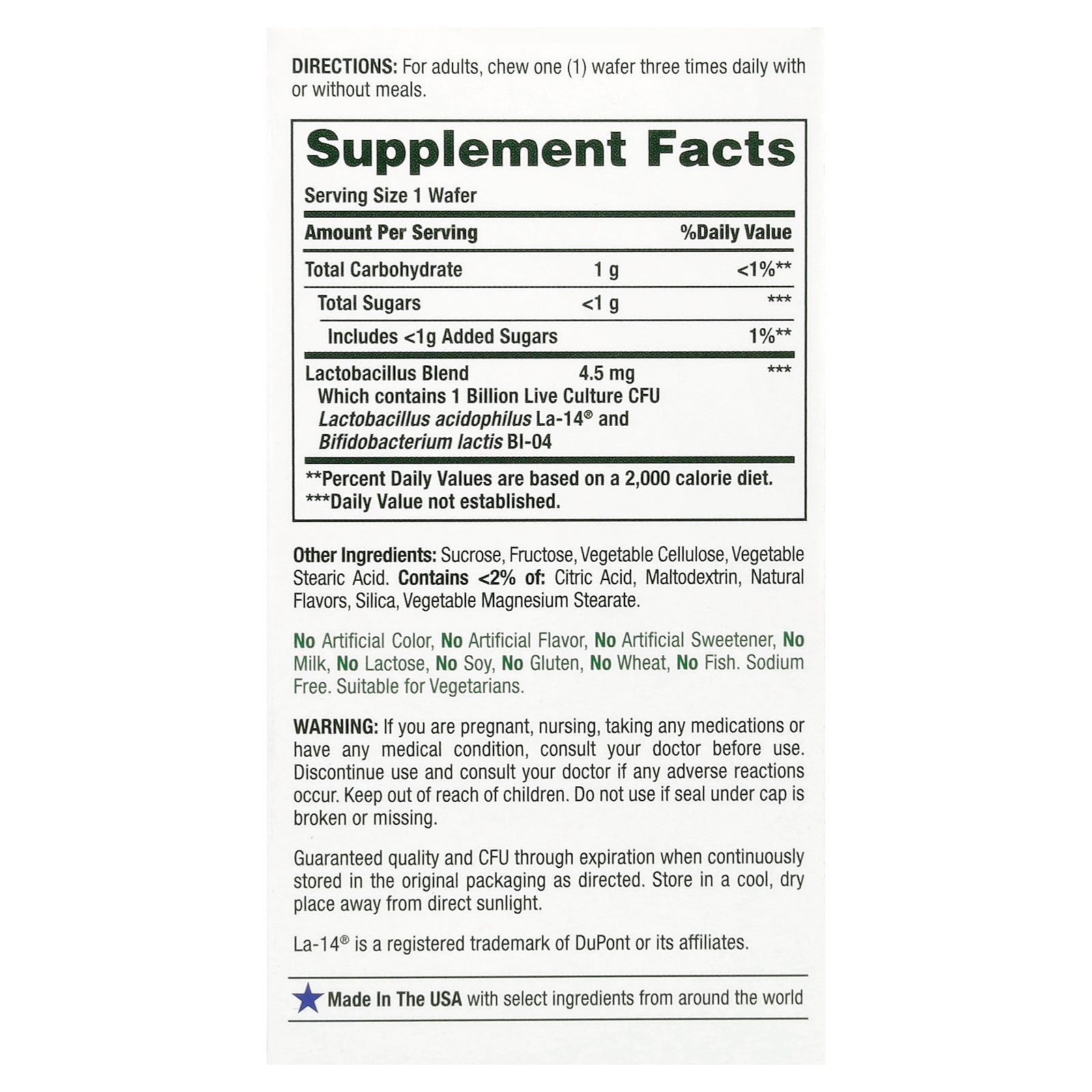 Each strawberry flavored, milk-free chewable wafer contains a mix of two classic probiotic strains and is guaranteed to deliver one billion live cultures.