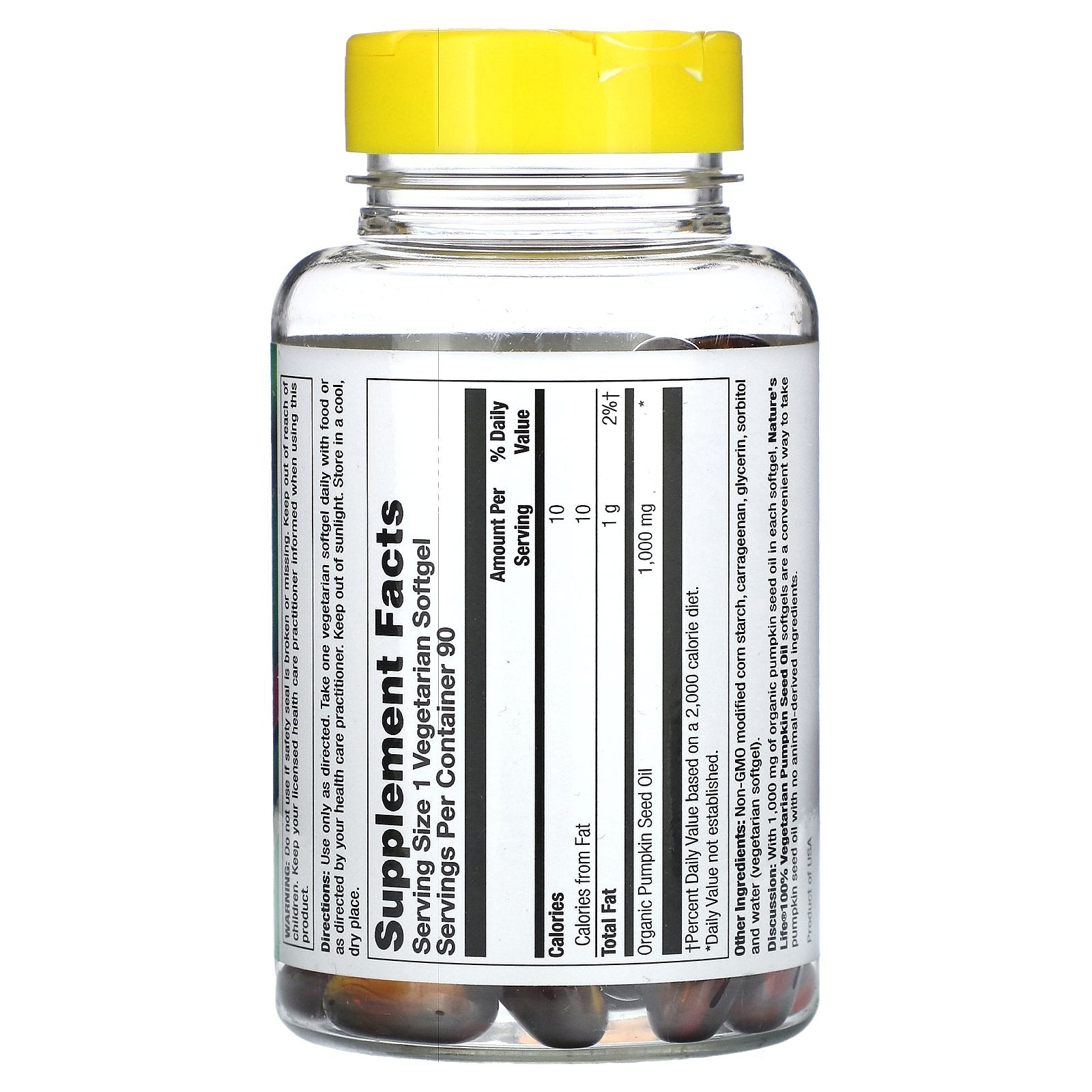 Discussion: With 1,000 mg of organic pumpkin seed oil in each softgel, Nature's Life®100% Vegetarian Pumpkin Seed Oil softgels are a convenient way to take pumpkin seed oil with no animal-derived ingredients.