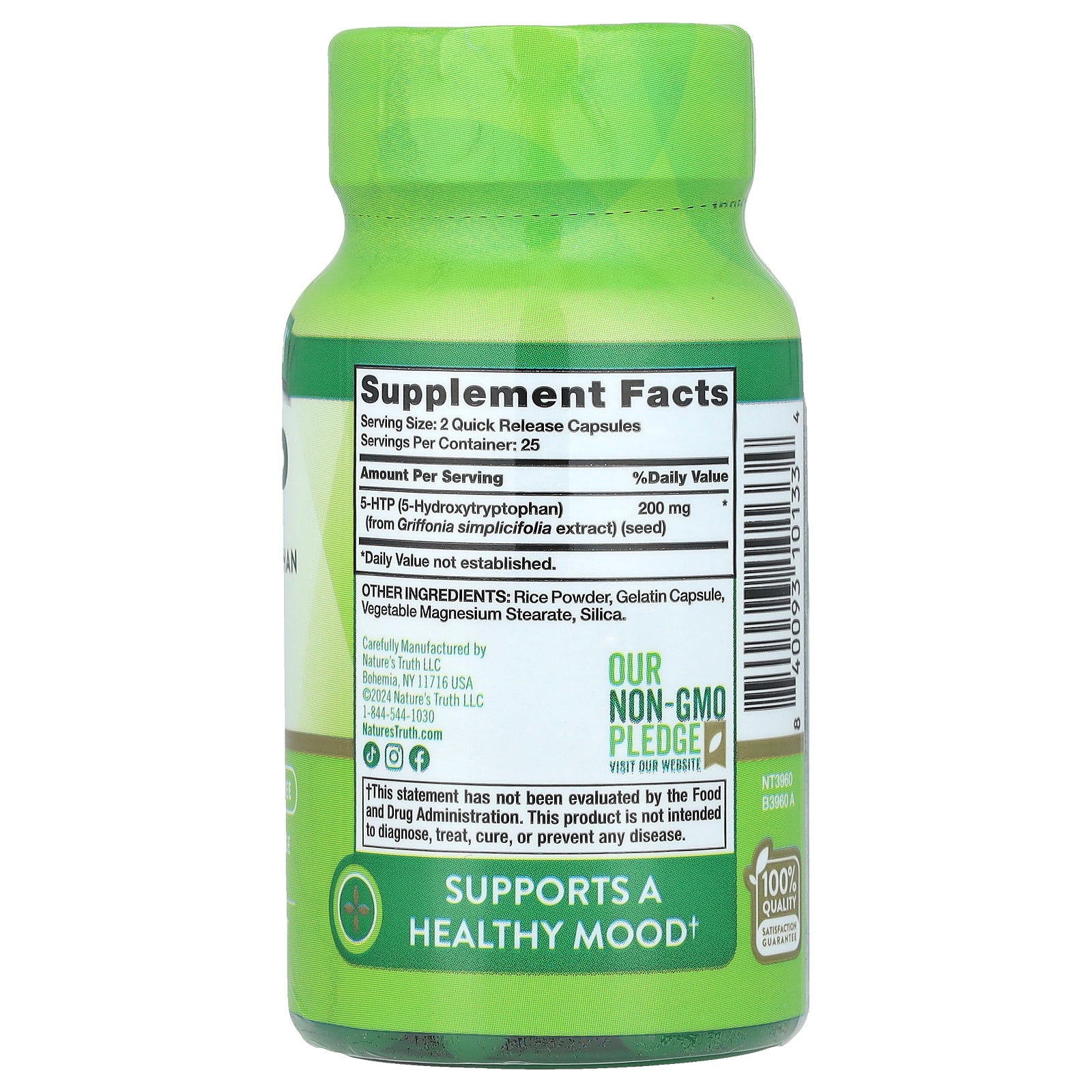Nature’s Truth 5-HTP capsules offer 200 mg of 5-HTP per serving derived from Griffonia simplicifolia seed extract. Each daily serving delivers the benefits of 5-HTP and supports a healthy mood. Adults can take two quick release capsules, preferably with a meal or at bedtime to minimize potential side effects, like nausea and drowsiness.