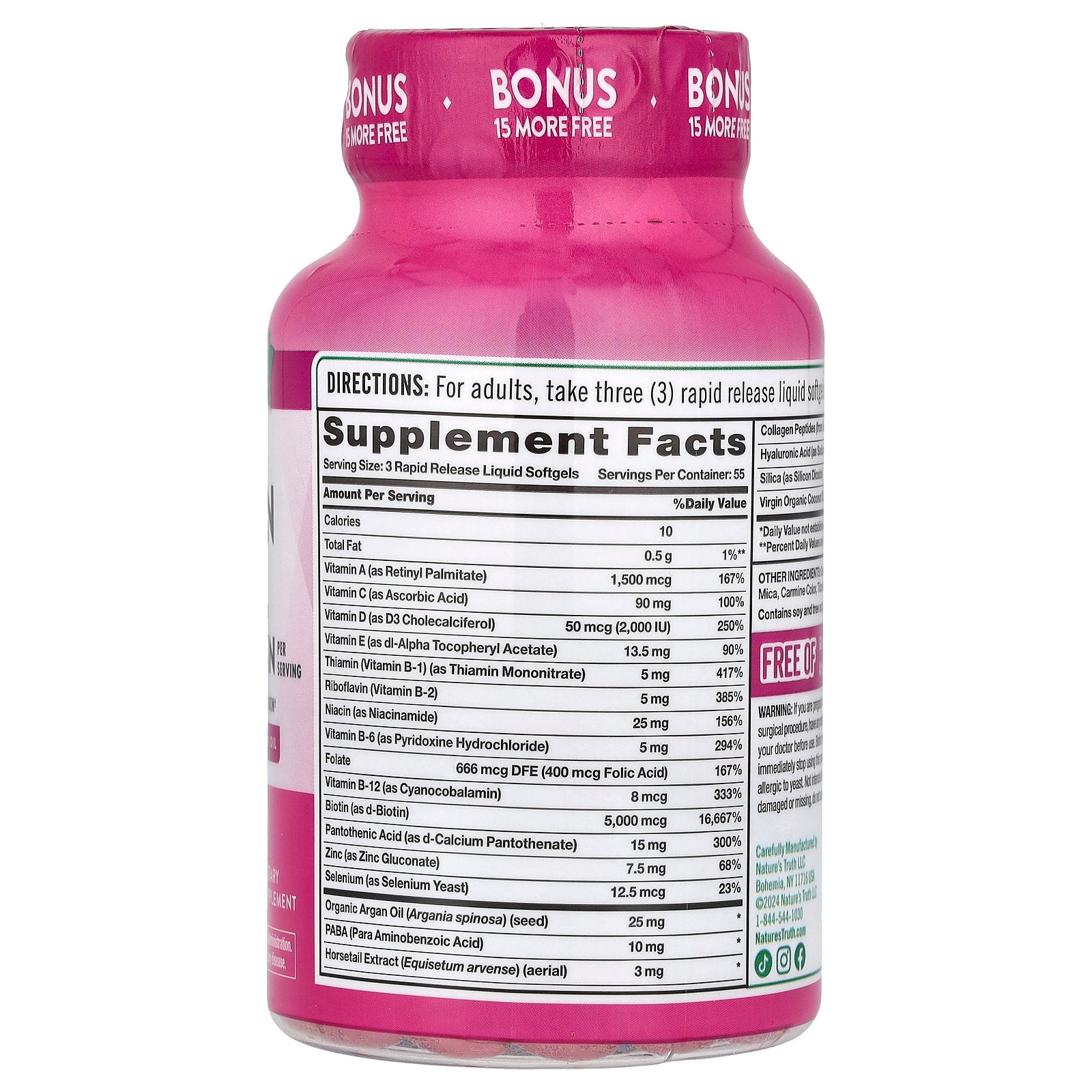 Each serving of Nature’s Truth Hair, Skin, Nails delivers 5,000 mcg of Biotin (also known as Vitamin B-7), an essential B Vitamin your body needs, but cannot produce. These rapid release liquid softgels include Vitamin C, Argan Oil, Collagen, and Coconut Oil for additional support.