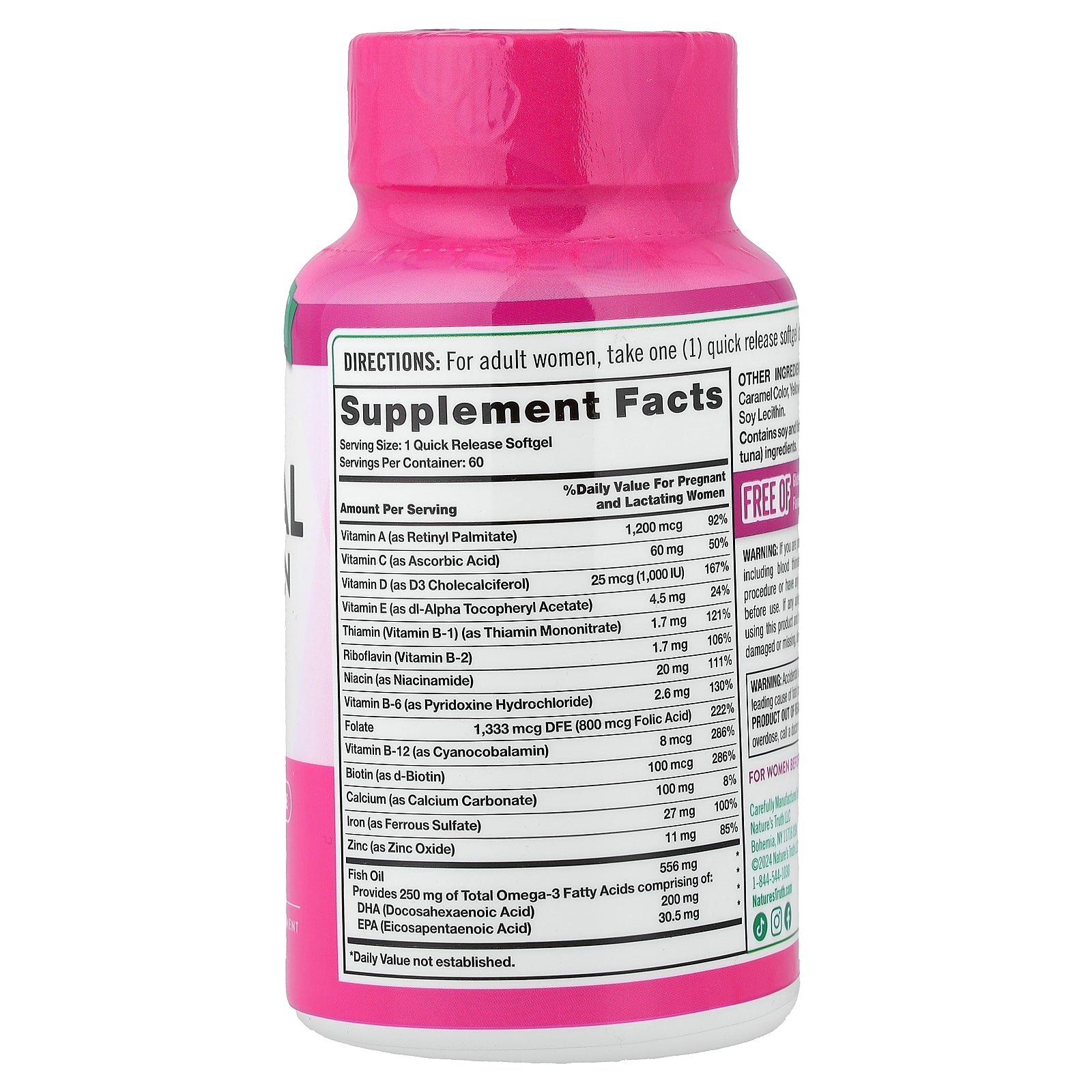 Our Prenatal Multivitamin Softgels contain an array of vitamins and minerals for women before, during, and after pregnancy. Each serving contains 800 mcg Folic Acid as well as 556 mg of Fish Oil, including beneficial DHA and EPA. Just one quick release softgel per day is all you need.