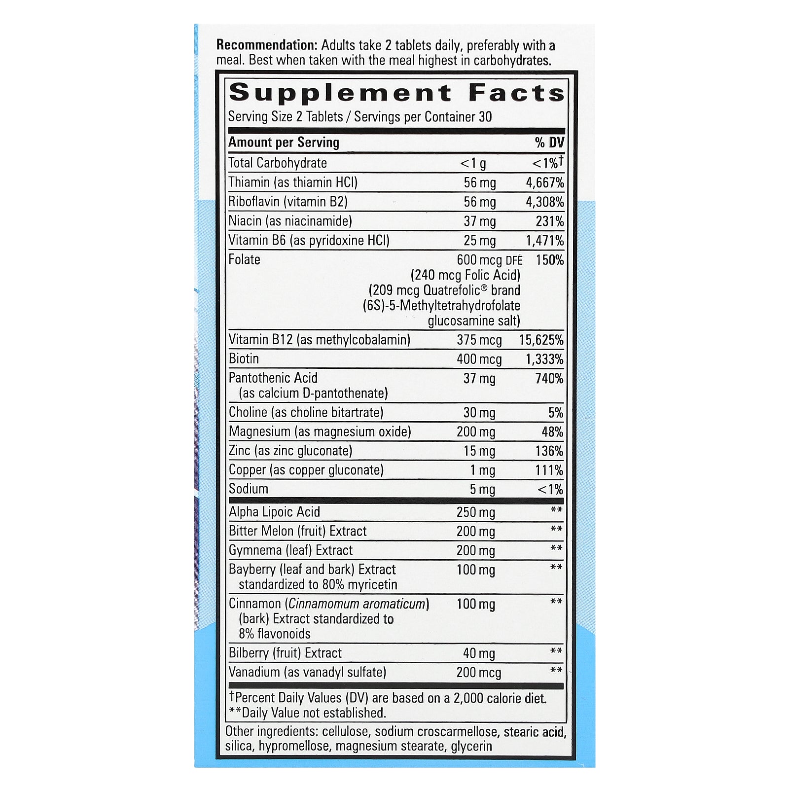 Adults take 2 tablets daily, preferably with a meal. Best when taken with the meal highest in carbohydrates.