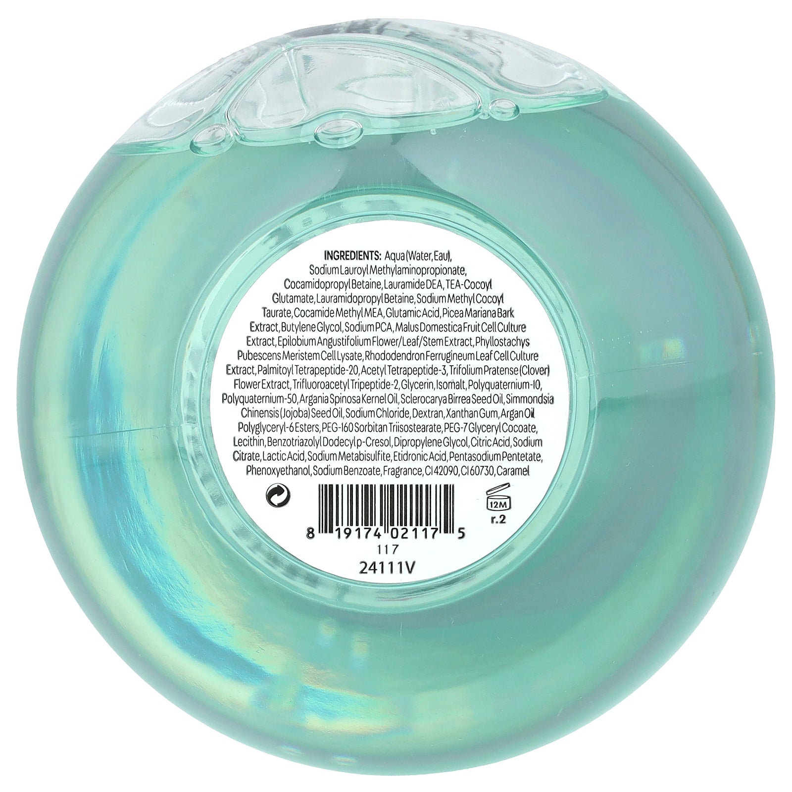 Aqua (water,eau), sodium lauroyl methylaminopropionate, cocamidopropyl betaine, lauramide dea, tea-cocoyl glutamate, lauramidopropyl betaine, sodium methyl cocoyl taurate, cocamide methyl mea, glutamic acid, picea mariana bark extract, butylene glycol, sodium pca, malus domestica fruit cell culture extract, epilobium angustifolium flower/leaf/stem extract, phyllostachys pubescens meristem cell lysate, rhododendron ferrugineum leaf cell culture extract, palmitoyl tetrapeptide-20,acetyl tetrapeptide-3, trifolium pratense (clover) flower extract, trifluoroacetyl tripeptide-2, glycerin, isomalt, polyquaternium-10, polyquaternium-50, argania spinosa kernel oil, sclerocarya birrea seed oil, simmondsia chinensis (jojoba) seed oil, sodium chloride, dextran, xanthan gum, argan oil polyglyceryl-6 esters, peg-160 sorbitan triisostearate, peg-7 glyceryl cocoate, lecithin, benzotriazolyl dodecylp-cresol,dipropylene glycol, citric acid, sodium citrate, lactic acid, sodium metabisulfite, etidronic acid, pentasodium pentetate phenoxyethanol, sodium benzoate, fragrance, ci 42090, ci60730, caramel.