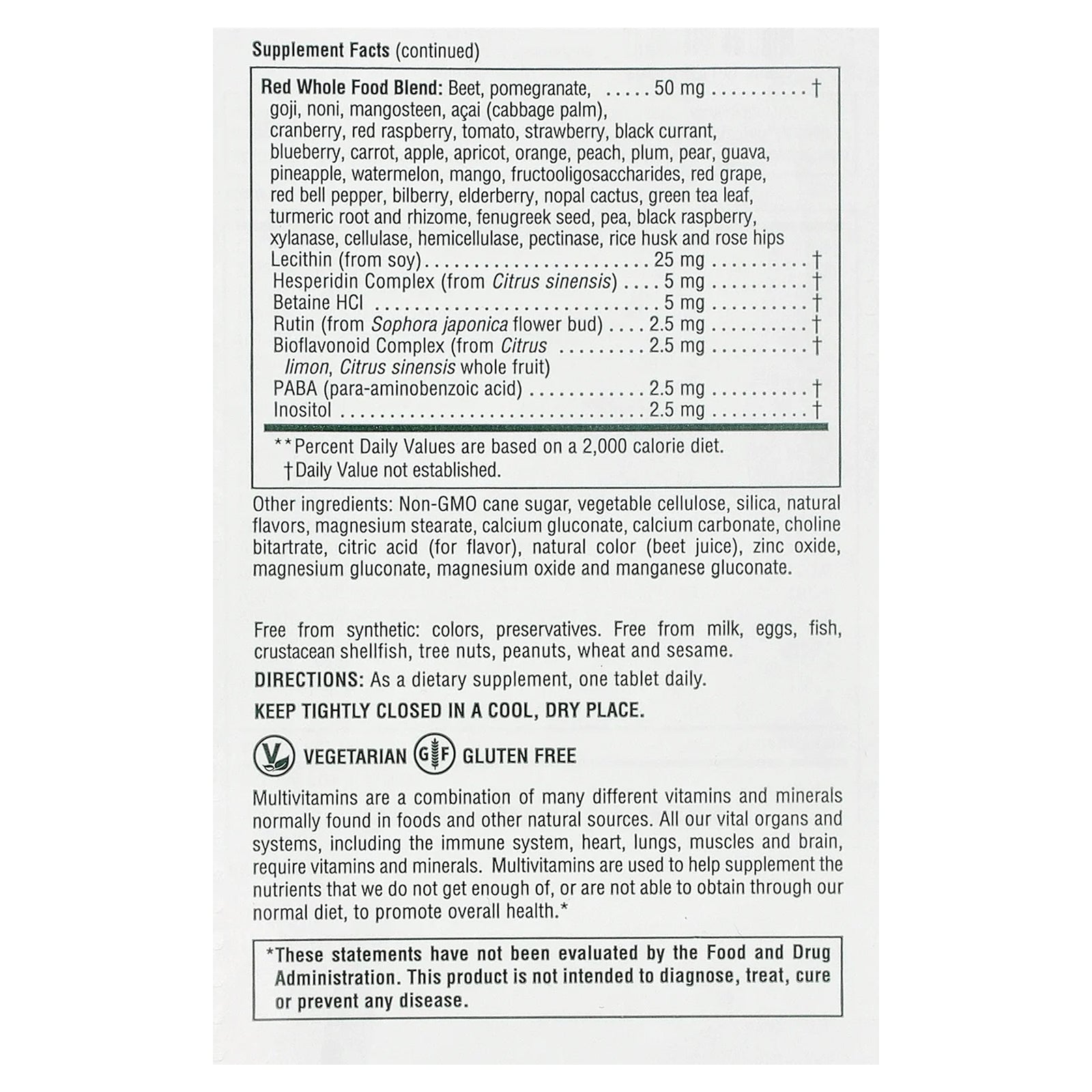 Non-GMO cane sugar, vegetable cellulose, silica, natural flavors, magnesium stearate, calcium gluconate, calcium carbonate, choline bitartrate, citric acid (for flavor), natural color (beet juice), zinc oxide, magnesium gluconate, magnesium oxide and manganese gluconate.