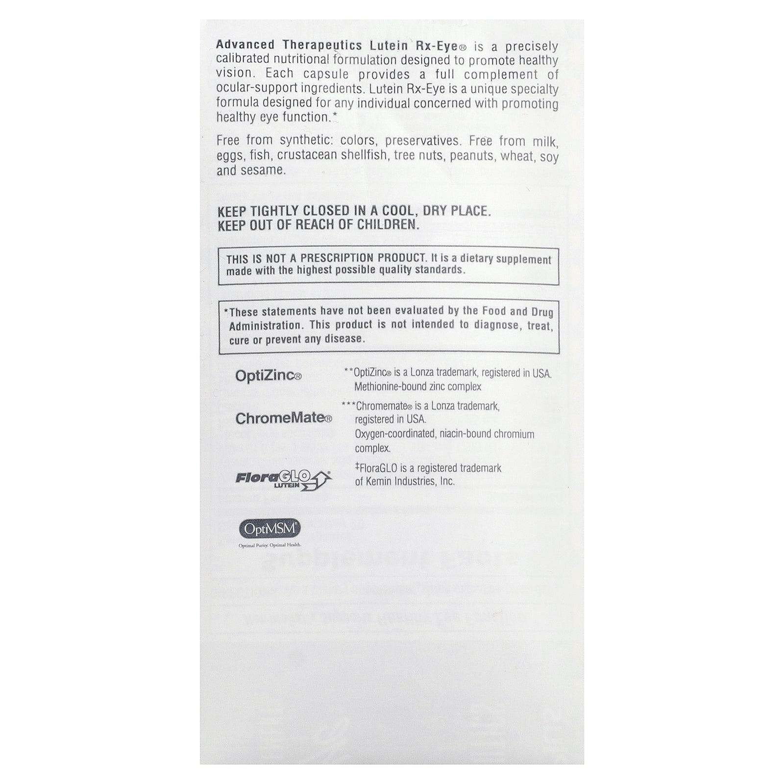 Advanced Therapeutics Lutein Rx-Eye® is a precisely calibrated nutritional formulation designed to promote healthy vision. Each capsule provides a full complement of ocular-support ingredients. Lutein Rx-Eye is a unique specialty formula designed for any individual concerned with promoting healthy eye function.