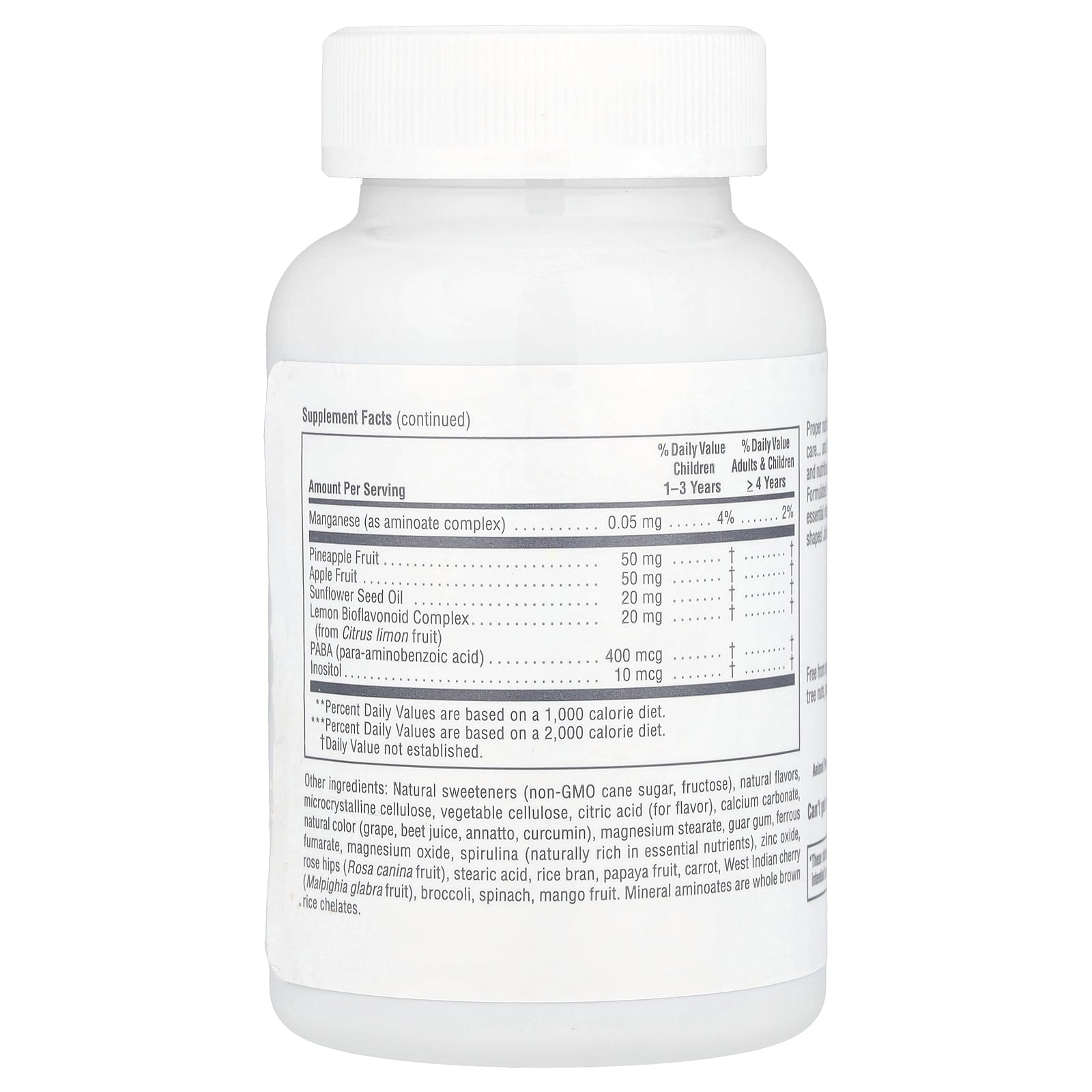 Natural sweeteners (non-GMO can sugar, fructose), natural flavors, microcrystalline cellulose, vegetable cellulose, citric acid (for flavor), calcium carbonate, natural color (grape, beet juice, annatto, curcumin), magnesium stearate, guar gum, ferrous fumarate, magnesium oxide, spirulina (naturally rich in essential nutrients), zinc oxide, rose hips (rosa canina fruit), stearic acid, rice bran, papaya fruit, carrot, west indian cherry (malpighia glabra fruit), broccoli, spinach, mango fruit.