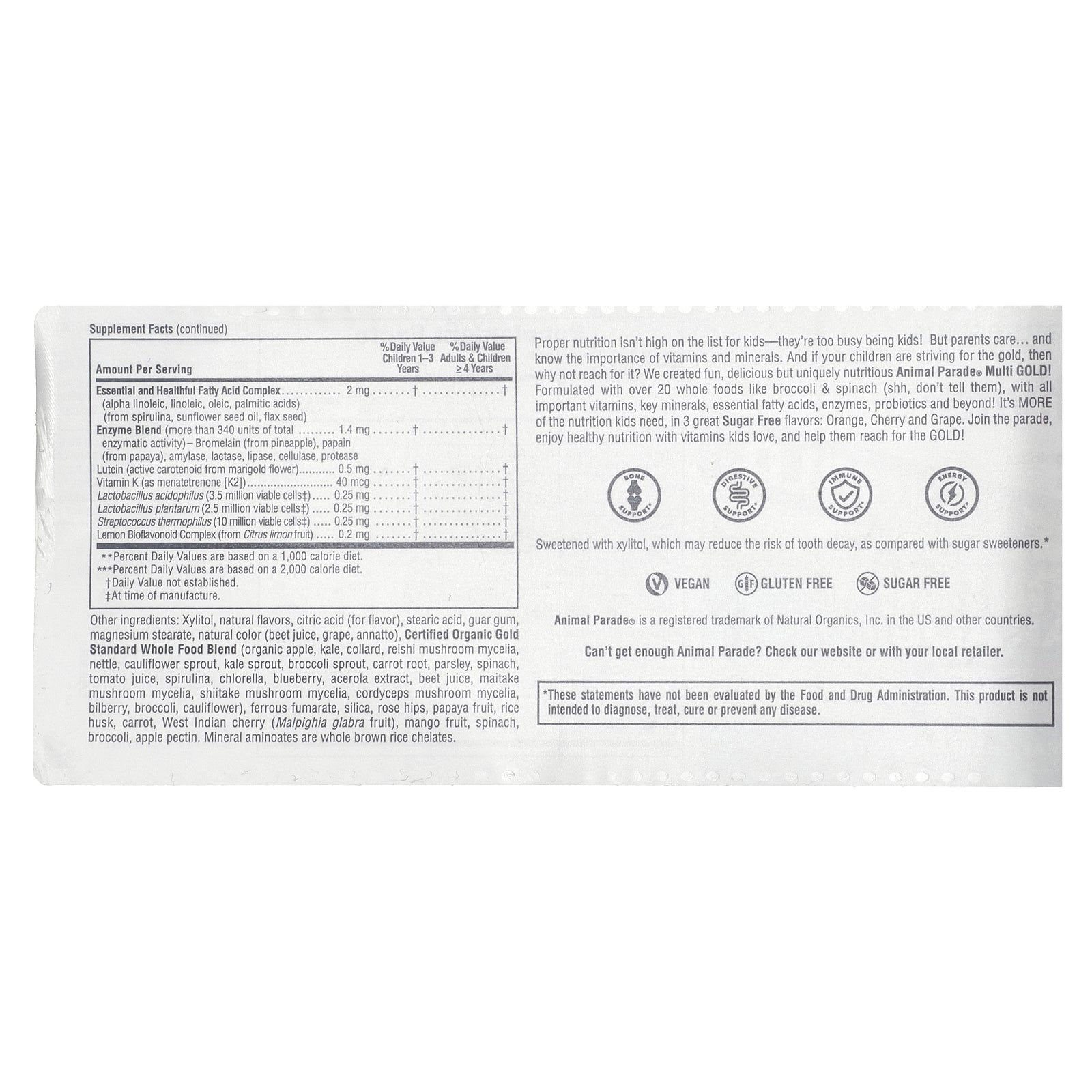 Proper nutrition isn't high on the list for kids-they're too busy being kids! But parents care ... and know the importance of vitamins and minerals. And if your children are striving for the gold, then why not reach for it? We created fun, delicious but uniquely nutritious Animal Parade® Multi GOLD! Formulated with over 20 whole foods like broccoli & spinach (shh, don't tell them), with all important vitamins, key minerals, essential fatty acids, enzymes, probiotics and beyond! It's MORE of the nutrition kids need, in 3 great Sugar Free flavors: Orange, Cherry and Grape. Join the parade, enjoy healthy nutrition with vitamins kids love, and help them reach for the GOLD!