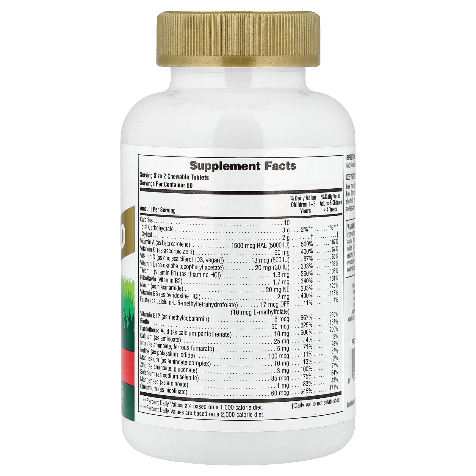 Xylitol, magnesium stearate, citric acid (for flavor), guar gum, natural flavors, certified organic gold standard whole food blend (organic apple, kale, collard, reishi mushroom mycelia, nettle, cauliflower sprout, kale sprout, broccoli sprout, carrot root, parsley, spinach, tomato juice, spirulina, chlorella, blueberry, acerola extract, beet juice, maitake mushroom mycelia, shiitake mushroom mycelia, cordyceps mushroom mycelia, bilberry, broccoli, kale, cauliflower), natural color (beet juice), rose hips (rosa canina fruit), rice bran, papaya fruit, west indian cherry (malpighia glabra fruit), carrot, mango fruit, broccoli, spinach, apple pectin, stearic acid. mineral aminoates are whole brown rice chelates.