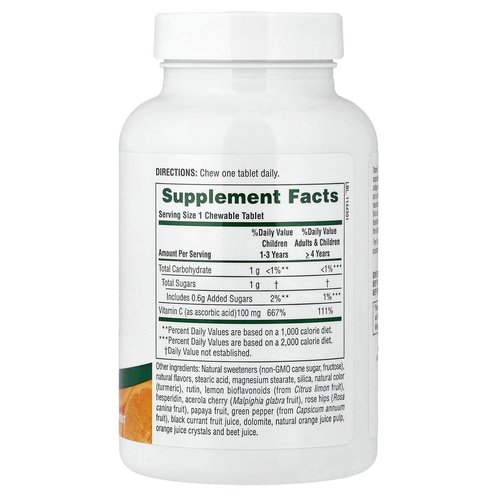 Natural sweeteners (non-gmo cane sugar, fructose natural flavors, stearic acid, magnesium stearate, silica, natural color (turmeric), rutin, lemon bioflavonoids (from citrus limon fruit), hesperidin, acerola cherry (malpighia glabra fruit), rose hips (rosa canina fruit), papaya fruit, green pepper (from capsicum annuum fruit), black currant fruit juice, dolomite, natural orange juice pulp, orange juice crystals and beet juice.