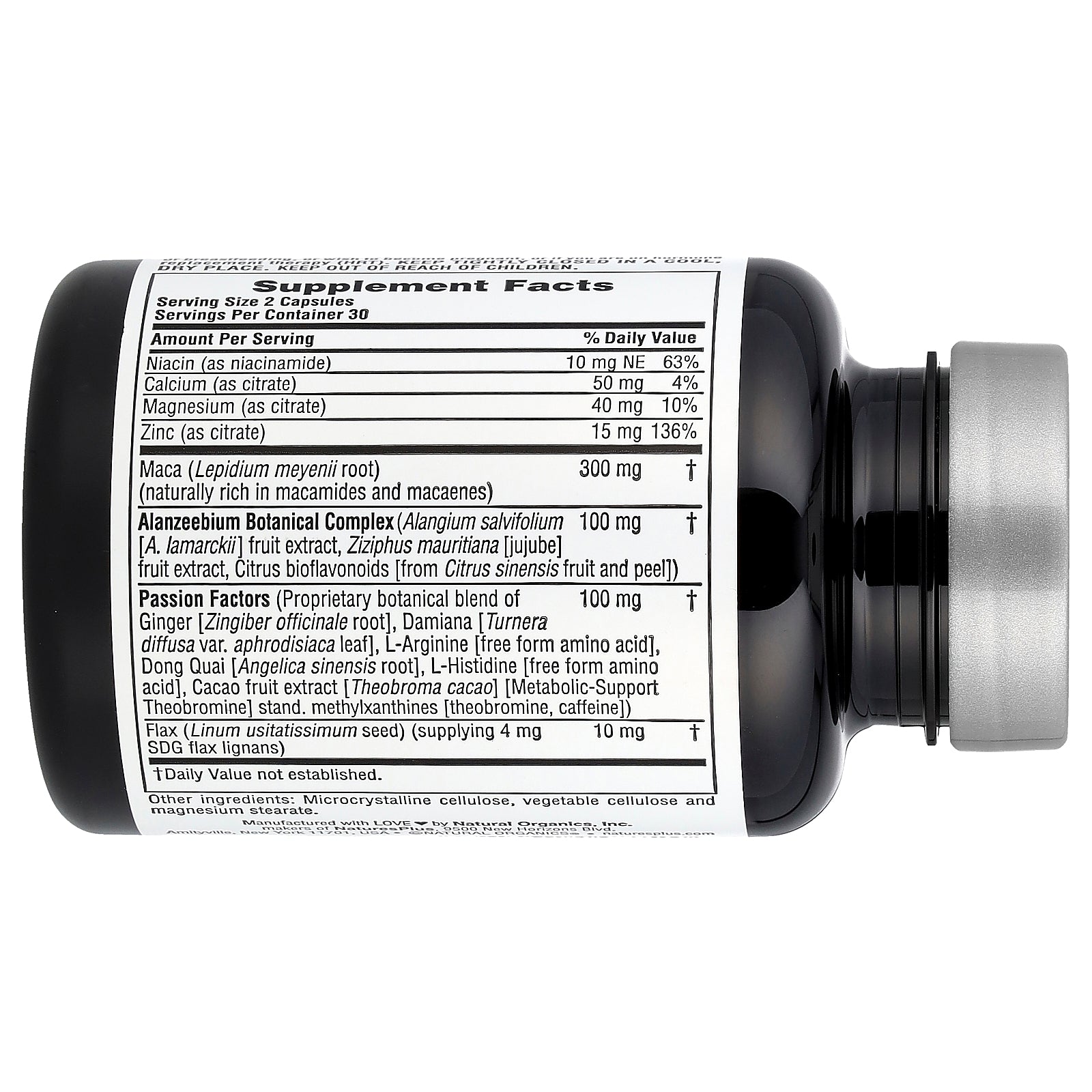 | Passion Factors (Proprietary botanical blend of Ginger [Zingiber officinale root], Damiana [Turnera diffusa var. aphrodisiaca leaf]), L-Arginine (free form amino acid), Dong Quai [Angelica sinensis root], L-Histidine (free form amino acid), Cacao Fruit Extract (Theobroma cacao) [Metabolic-Support theobromine] stand. methylxanthines [theobromine, caffeine] | 100 mg | † |