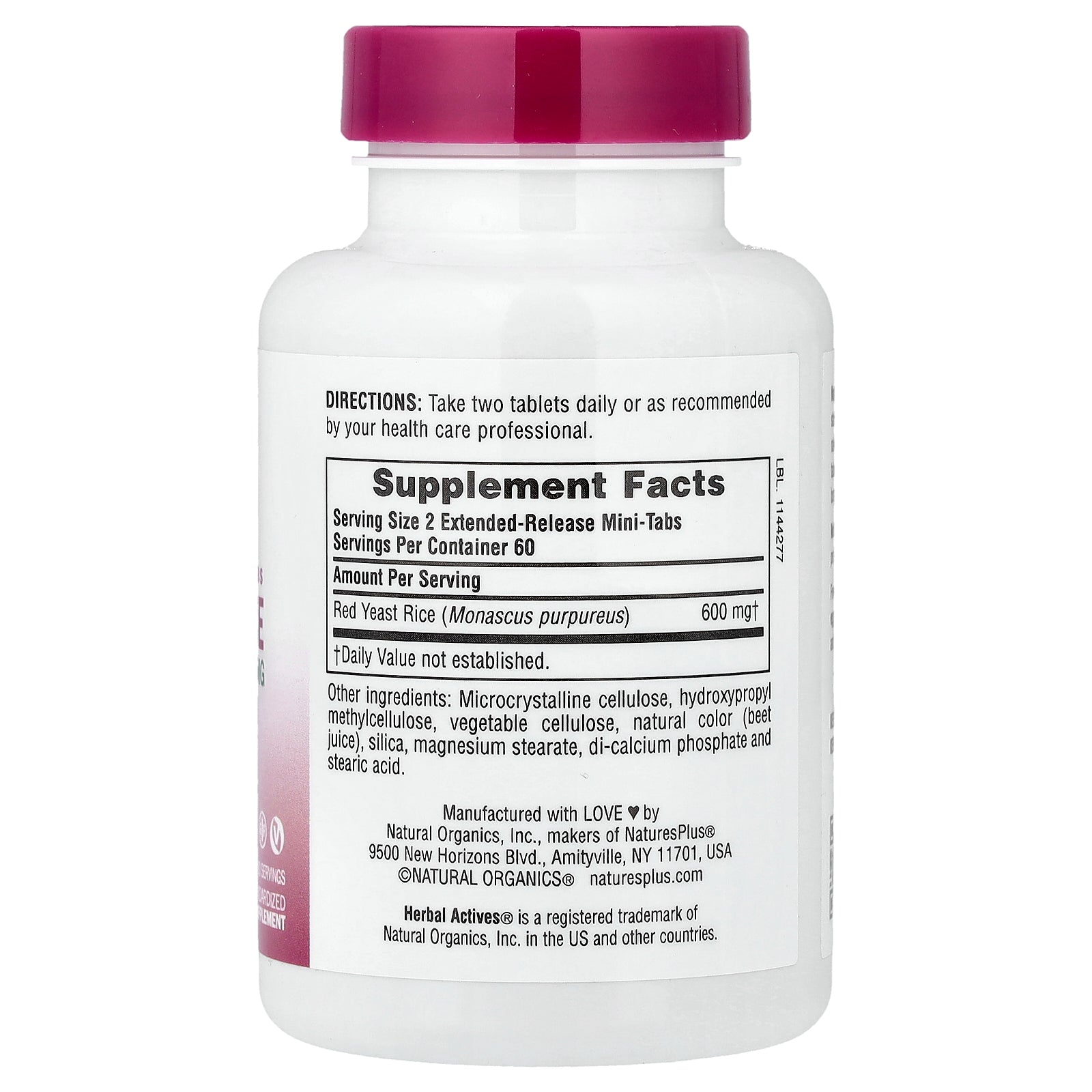 NaturesPlus® Herbal Actives Red Yeast Rice extract is standardized to provide the full range of active constituents naturally occurring in red yeast rice. Each extended-release tablet supplies rapid and sustained activity, providing the active botanical principles.