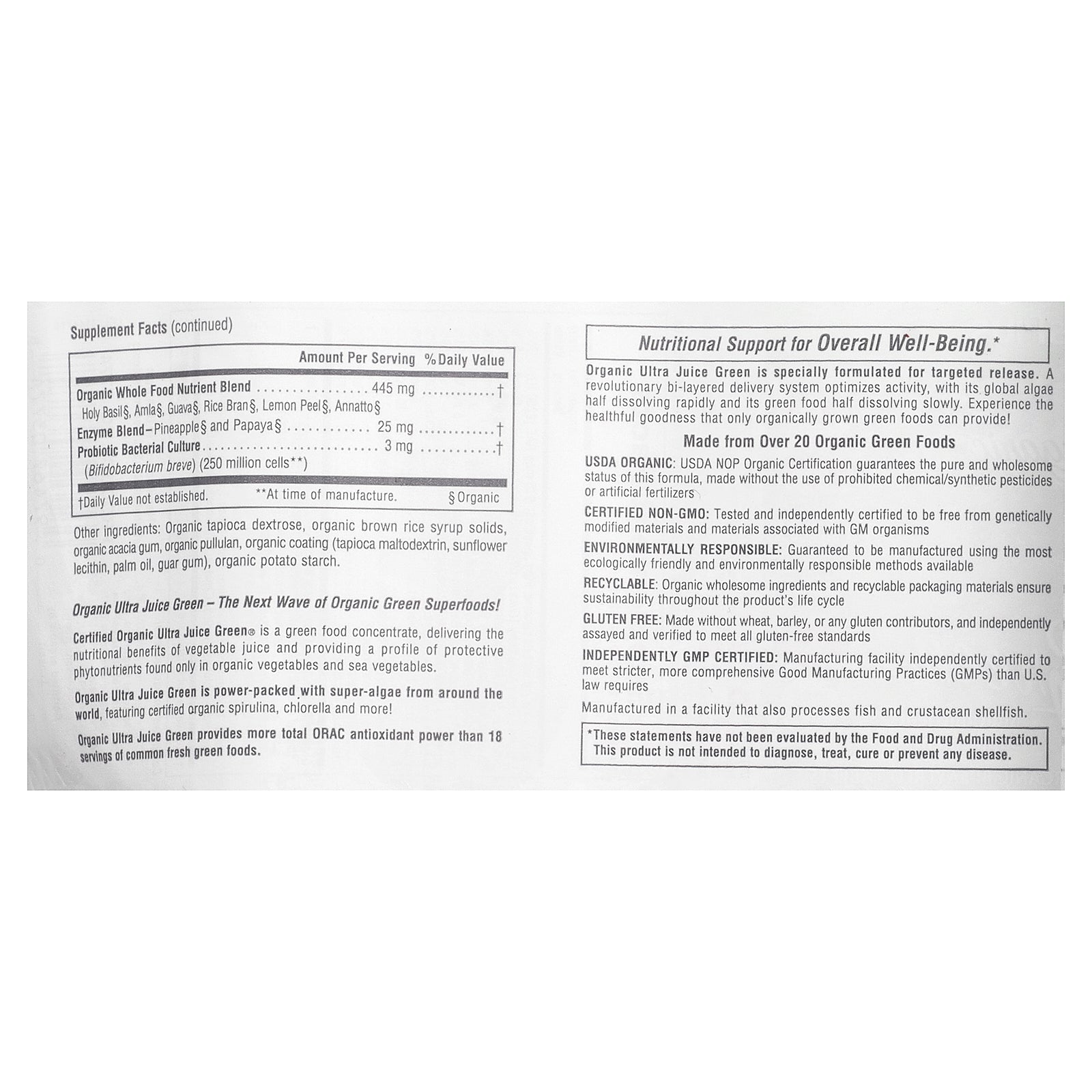 Organic Ultra Juice Green is specially formulated for targeted release. A revolutionary bi-layered delivery system optimizes activity, with its global algae half dissolving rapidly and its green food half dissolving slowly. Experience the healthful goodness that only organically grown green foods can provide!