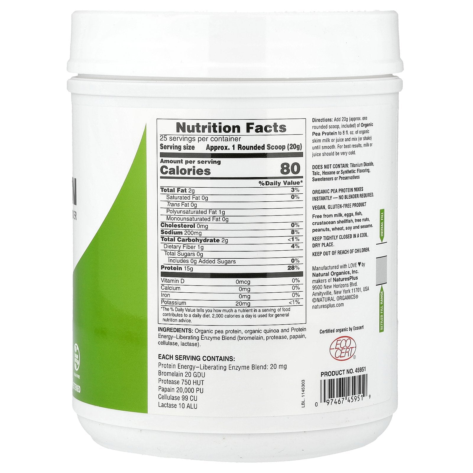 NaturesPlus® Organic Pea Protein delivers the revitalizing protein you need to power your day and keep your body healthy! With its superior taste, this instant protein can be enjoyed for breakfast, lunch, dinner, or anytime you need an energy boost. This pure and natural protein comes straight from peas, allowing you to get all the natural benefits without any synthetic additives. Each serving is supercharged with protein energy-liberating enzymes, delivering the surge of vitality your body craves!