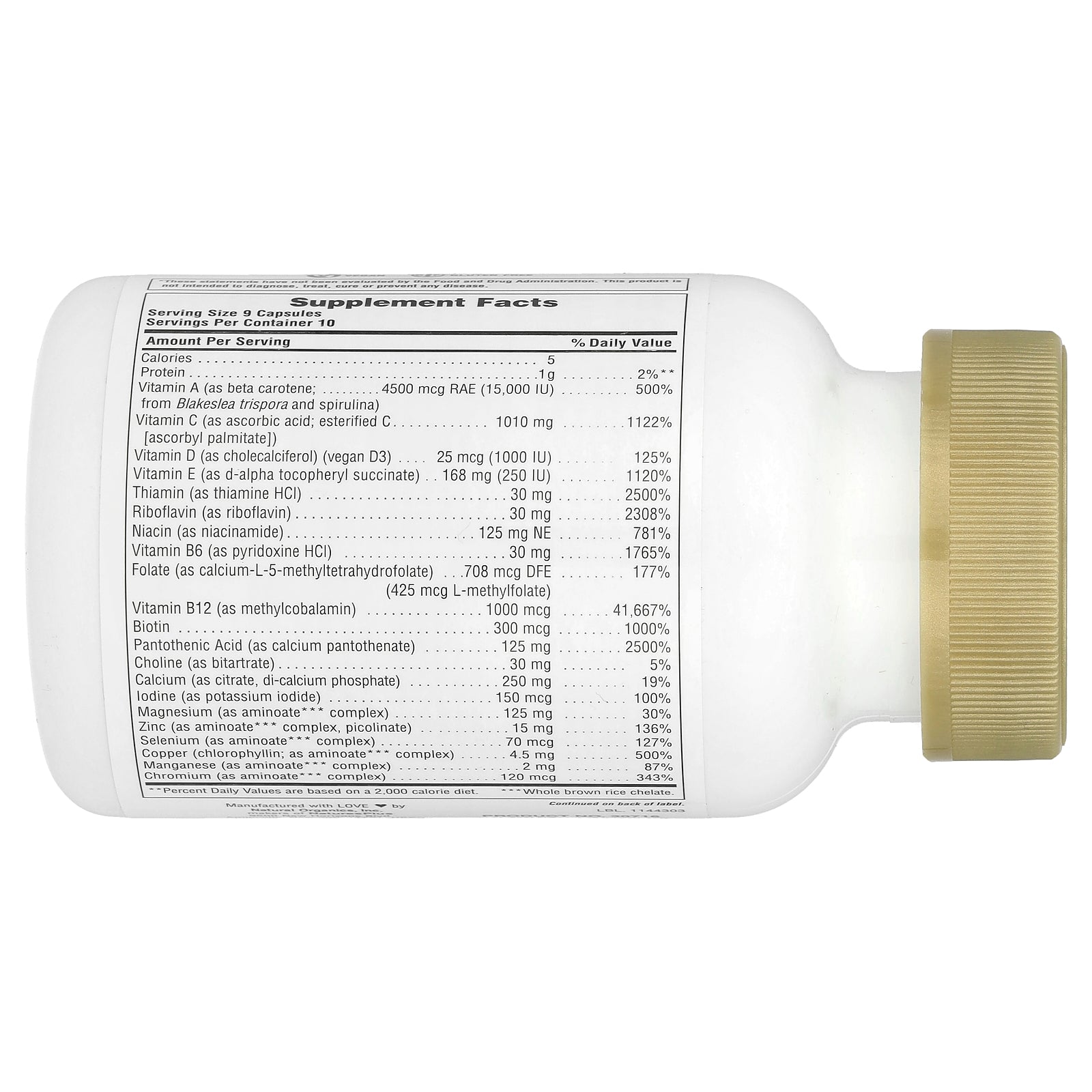 | Vitamin A (as beta carotene; from Blakeslea trispora and spirulina) | 4500 mcg RAE (15,000 IU) |