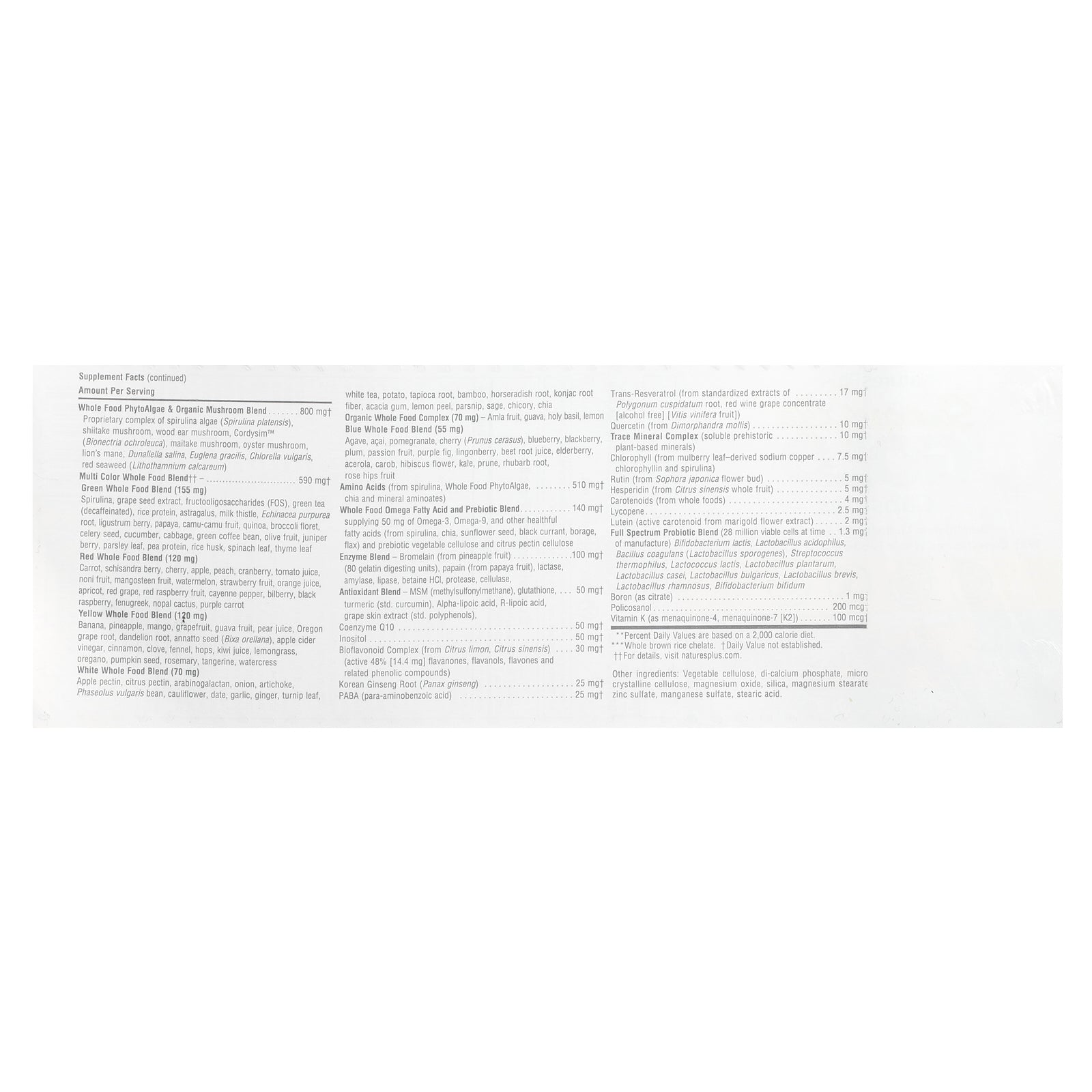 Multi Color Whole Food Blend Green Whole Food Blend (155 mg) Spirulina, grape seed extract, fructooligosaccharides (FOS), green tea (decaffeinated), rice protein, astragalus, milk thistle, Echinacea purpurea root, ligustrum berry, papaya, camu-camu fruit, quinoa, broccoli floret, celery seed, cucumber, cabbage, green coffee bean, olive fruit, juniper berry, parsley leaf, pea protein, rice husk, spinach leaf, thyme leaf Red Whole Food Blend (120 mg) Carrot, schisandra berry, cherry, apple, peach, cranberry, tomato juice, noni fruit, mangosteen fruit, watermelon, strawberry fruit, orange juice, apricot, red grape, red raspberry fruit, cayenne pepper, bilberry, black raspberry, fenugreek, nopal cactus, purple carrot Yellow Whole Food Blend (120 mg) Banana, pineapple, mango, grapefruit, guava fruit, pear juice, Oregon grape root, dandelion root, annatto seed (Bixa orellana), apple cider vinegar, cinnamon, clove, fennel, hops, kiwi juice, lemongrass, oregano, pumpkin seed, rosemary, tangerine, watercress White Whole Food Blend (70 mg) Apple pectin, citrus pectin, arabinogalactan, onion, artichoke, Phaseolus vulgaris bean, cauliflower, date, garlic, ginger, turnip leaf, white tea, potato, tapioca root, bamboo, horseradish root, konjac root fiber, acacia gum, lemon peel, parsnip, sage, chicory, chia Organic Whole Food Complex (70 mg) Amla fruit, guava, holy basil, lemon Blue Whole Food Blend (55 mg) Agave, açai, pomegranate, cherry (Prunus cerasus), blueberry, blackberry, plum, passion fruit, purple fig, lingonberry, beet root juice, elderberry, acerola, carob, hibiscus flower, kale, prune, rhubarb root, rose hips fruit |
