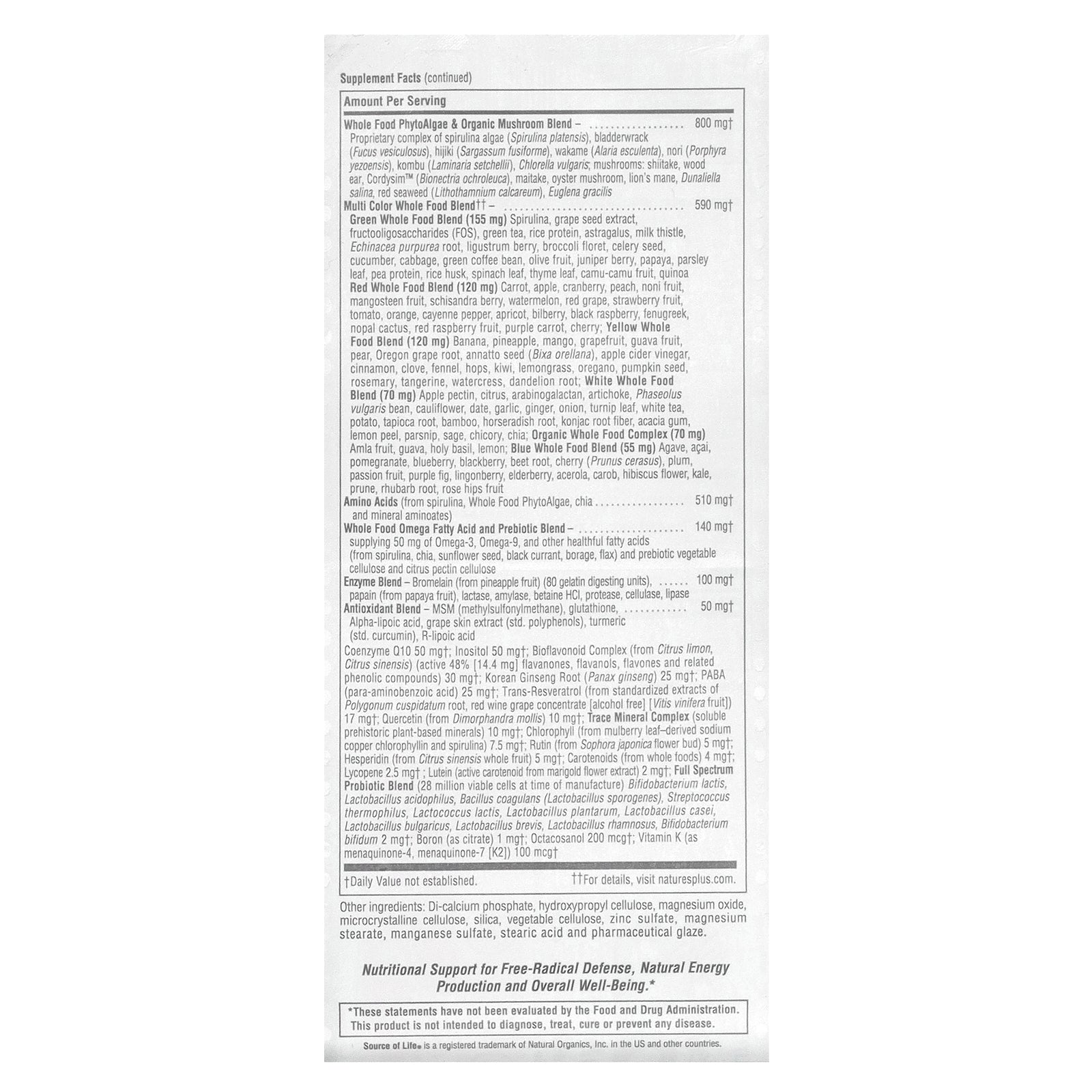 Green Whole Food Blend (155 mg) Spirulina, grape seed extract, fructooligosaccharides (FOS), green tea, rice protein, astragalus, milk thistle, Echinacea purpurea root, ligustrum berry, broccoli floret, celery seed, cucumber, cabbage, green coffee bean, olive fruit, juniper berry, papaya, parsley leaf, pea protein, rice husk, spinach leaf, thyme leaf, camu-camu fruit, quinoa Red Whole Food Blend (120 mg) Carrot, apple, cranberry, peach, noni fruit, mangosteen fruit, schisandra berry, watermelon, red grape, strawberry fruit, tomato, orange, cayenne pepper, apricot, bilberry, black raspberry, fenugreek, nopal cactus, red raspberry fruit, purple carrot, cherry Yellow Whole Food Blend (120 mg) Banana, pineapple, mango, grapefruit, guava fruit, pear, Oregon grape root, annatto seed (Bixa orellana), apple cider vinegar, cinnamon, clove, fennel, hops, kiwi, lemongrass, oregano, pumpkin seed, rosemary, tangerine, watercress, dandelion root White Whole Food Blend (70 mg) Apple pectin, citrus, arabinogalactan, artichoke, Phaseolus vulgaris bean, cauliflower, date, garlic, ginger, onion, turnip leaf, white tea, potato, tapioca root, bamboo, horseradish root, konjac root fiber, acacia gum, lemon peel, parsnip, sage, chicory, chia Organic Whole Food Complex (70 mg) Amla fruit, guava, holy basil, lemon Blue Whole Food Blend (55 mg) Agave, açai, pomegranate, blueberry, blackberry, beet root, cherry (Prunus cerasus), plum, passion fruit, purple fig, lingonberry, elderberry, acerola, carob, hibiscus flower, kale, prune, rhubarb root, rose hips fruit | ||