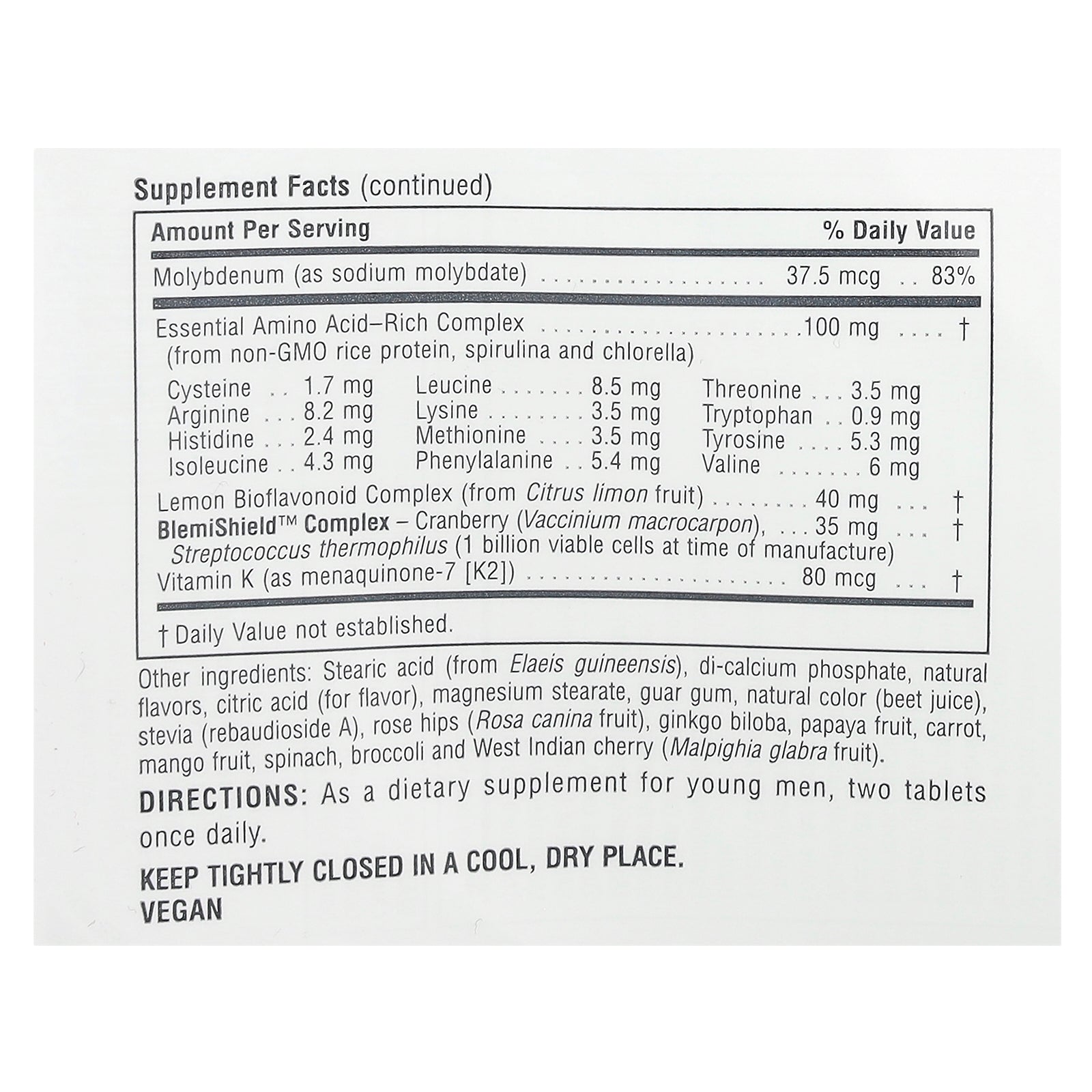 BlemiShield™ Complex - Cranberry (Vaccinium macrocarpon), Streptococcus thermophilus (1 billion viable cells at time of manufacture) |