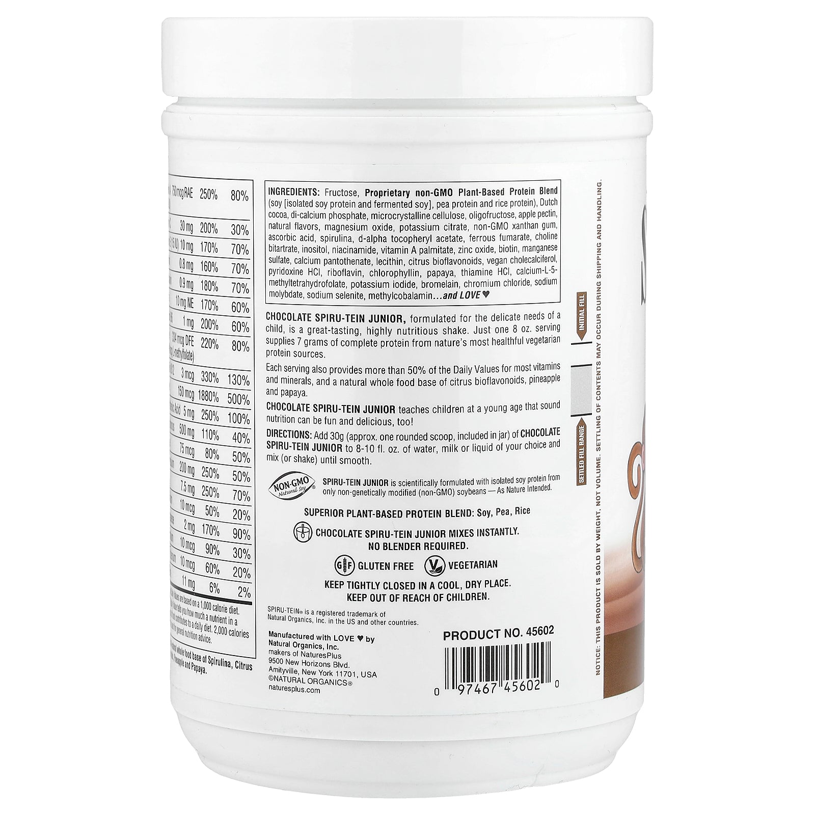 Chocolate Spiru-Tein Junior, formulated for the delicate needs of a child, is a great-tasting, highly nutritious shake. Just one 8 oz serving supplies 7 g of complete protein from nature's most healthful vegetarian protein sources.