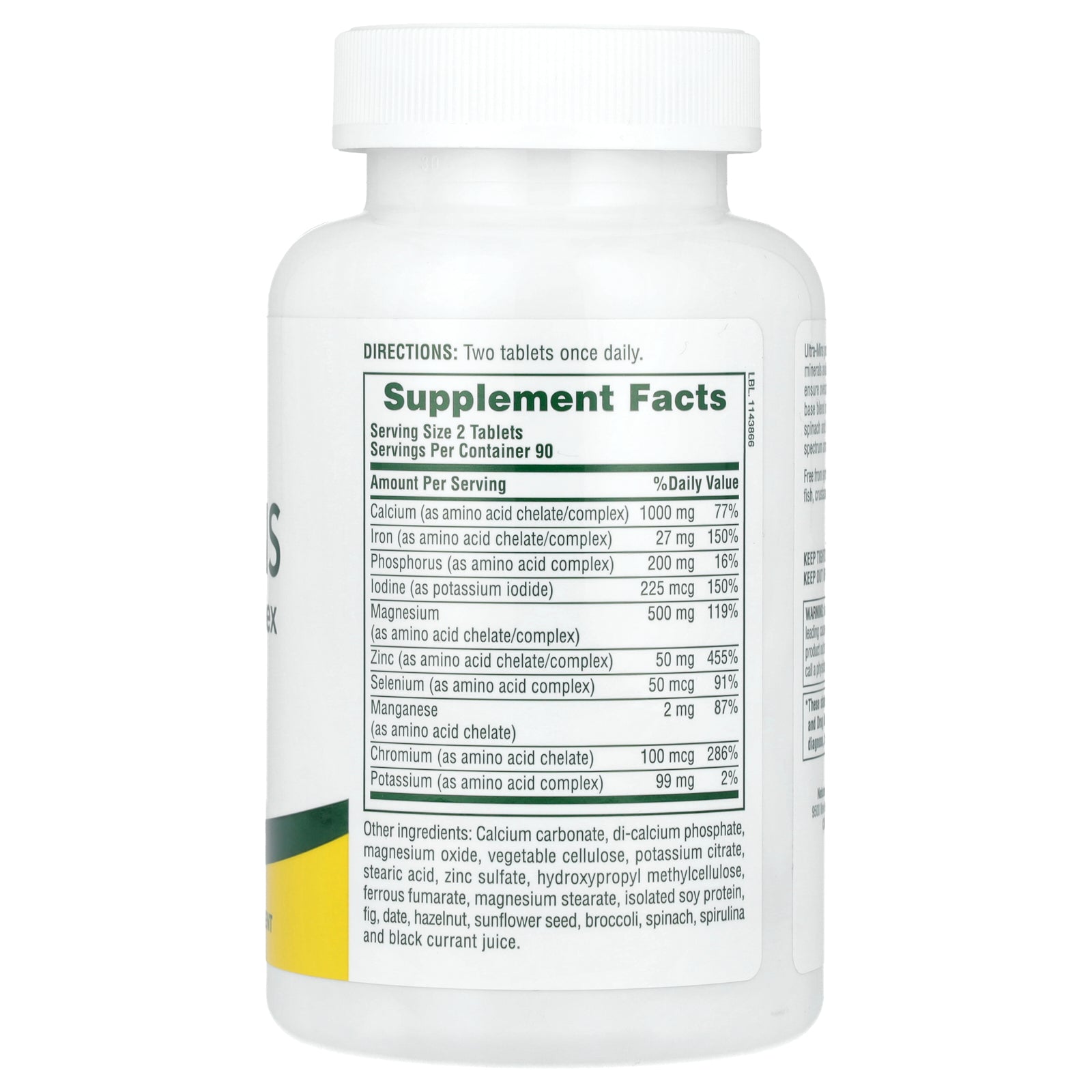 Calcium carbonate, di-calcium phosphate, magnesium oxide, vegetable cellulose, potassium citrate, stearic acid, zinc sulfate, hydroxypropyl methylcellulose, ferrous fumarate, magnesium stearate, isolated soy protein, fig, date, hazelnut, sunflower seed, broccoli, spinach, spirulina and black currant juice.
