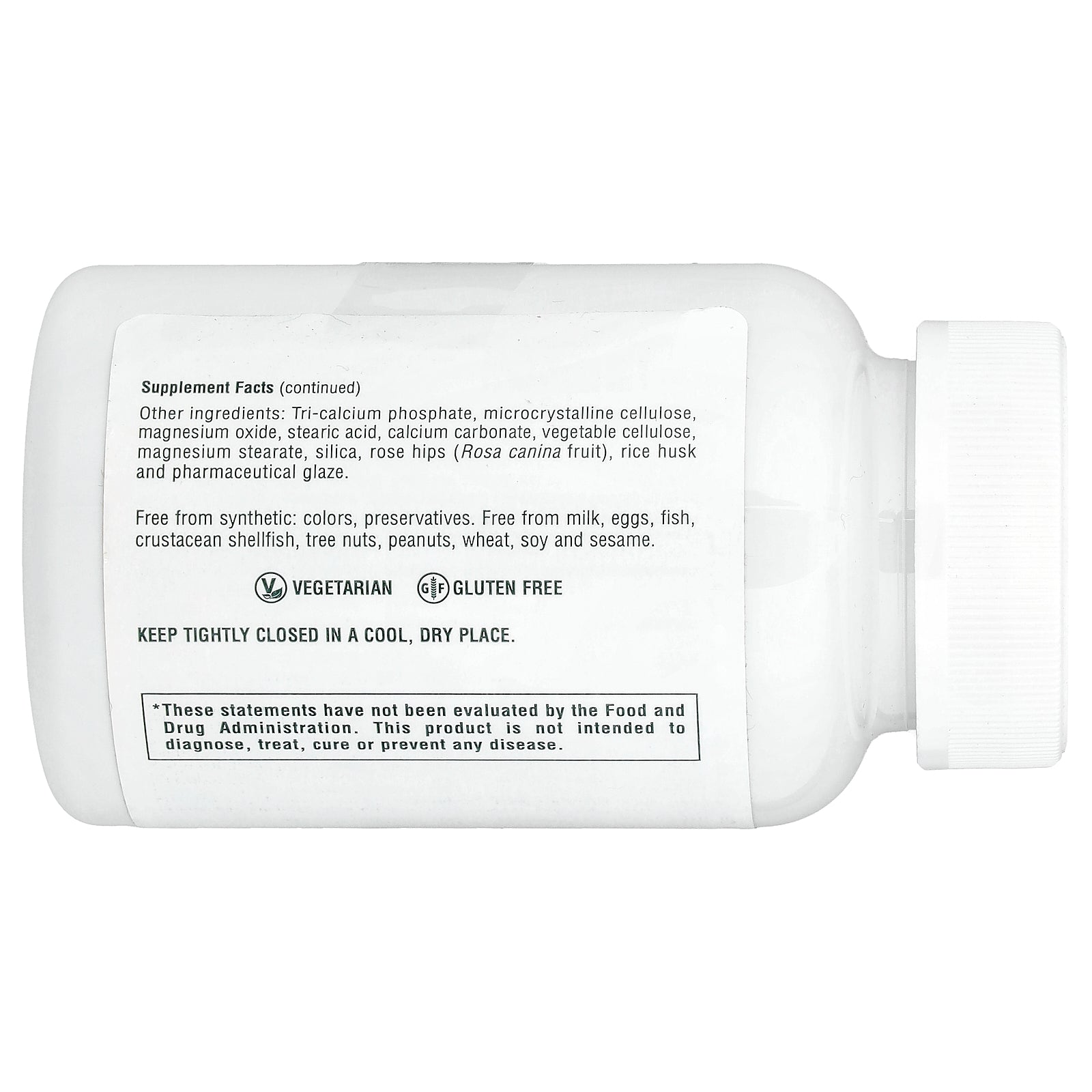 Tri-calcium phosphate, microcrystalline cellulose, magnesium oxide, stearic acid, calcium carbonate, vegetable cellulose, magnesium stearate, silica, rose hips (Rosa canina fruit), rice husk and pharmaceutical glaze.