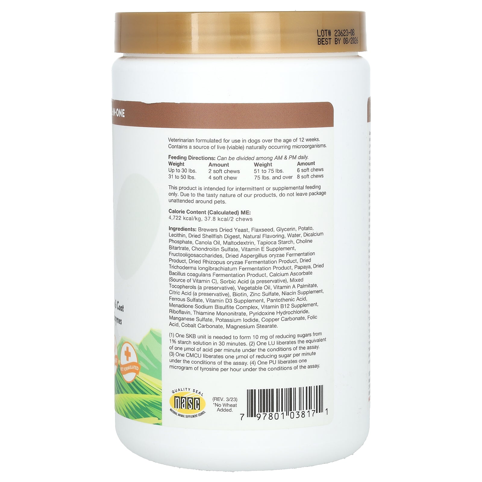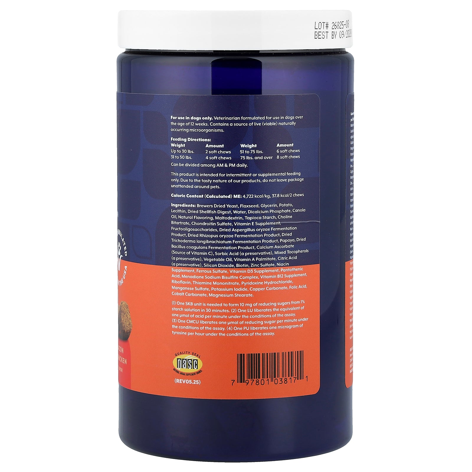 Brewers dried yeast, flaxseed, glycerin, potato, lecithin, dried shellfish digest, water, dicalcium phosphate, canola oil, natural flavoring, maltodextrin, tapioca starch, choline bitartrate, chondroitin sulfate, vitamin e supplement, fructooligosaccharides, dried aspergillus oryzae fermentation product, dried rhizopus oryzae fermentation product, dried trichoderma longibrachiatum fermentation product, papaya, dried bacillus coagulans fermentation product, calcium ascorbate (source of vitamin c), sorbic acid (a preservative), mixed tocopherols (a preservative), vegetable oil, vitamin a palmitate, citric acid (a preservative), silicon dioxide, biotin, zinc sulfate, niacin supplement, ferrous sulfate, vitamin d3 supplement, pantothenic acid, menadione sodium bisulfite complex, vitamin b12 supplement, riboflavin, thiamine mononitrate, pyridoxine hydrochloride, manganese sulfate, potassium lodide, copper carbonate, folic acid, cobalt carbonate, magnesium stearate.