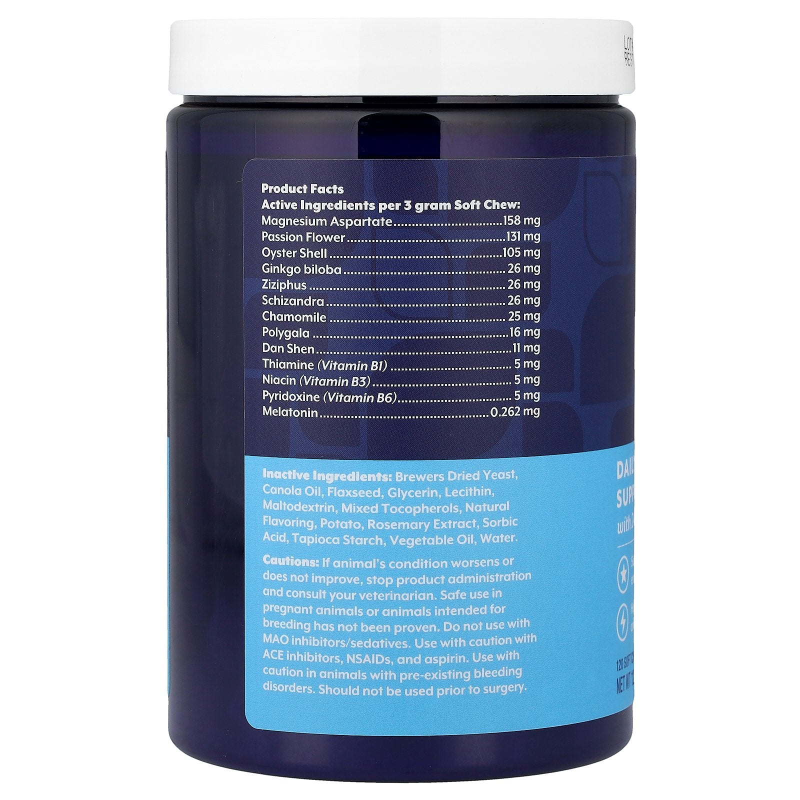 Veterinarian formulated for use in dogs over the age of 12 weeks. Contains botanicals to help promote normal emotional balance. With B-Vitamins to support calm behavior, a blend of Magnesium Aspartate, Passion Flower, and Melatonin to help promote restful relaxation, and Chamomile to support sensitive stomachs.