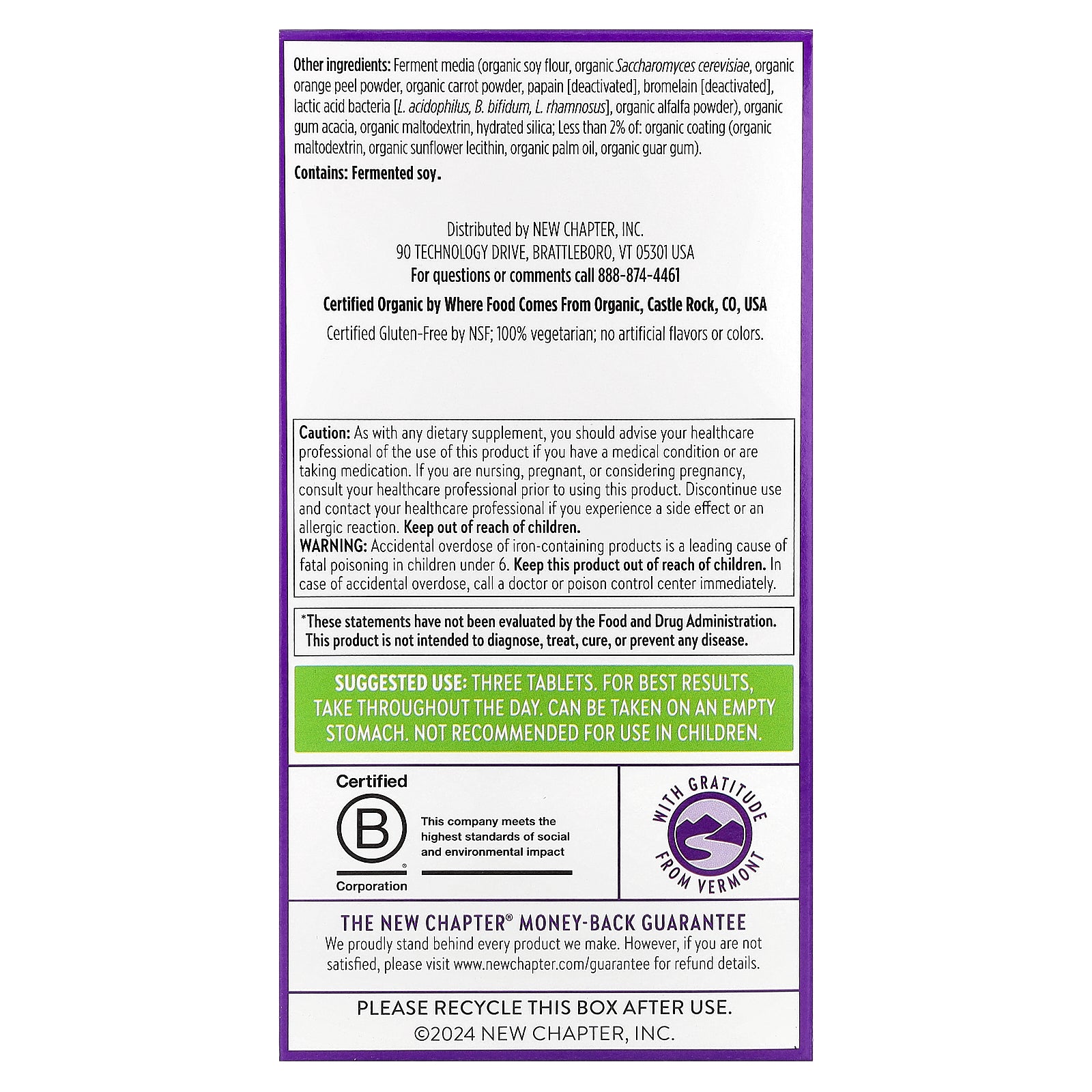 Ferment media (organic soy flour, organic Saccharomyces cerevisiae, organic orange peel powder, organic carrot powder, papain [deactivated], bromelain [deactivated], lactic acid bacteria [L. acidophilus, B. bifidum, L. rhamnosus], organic alfalfa powder), organic gum acacia, organic maltodextrin, hydrated silica; Less than 2% of: organic coating (organic maltodextrin, organic sunflower lecithin, organic palm oil, organic guar gum).