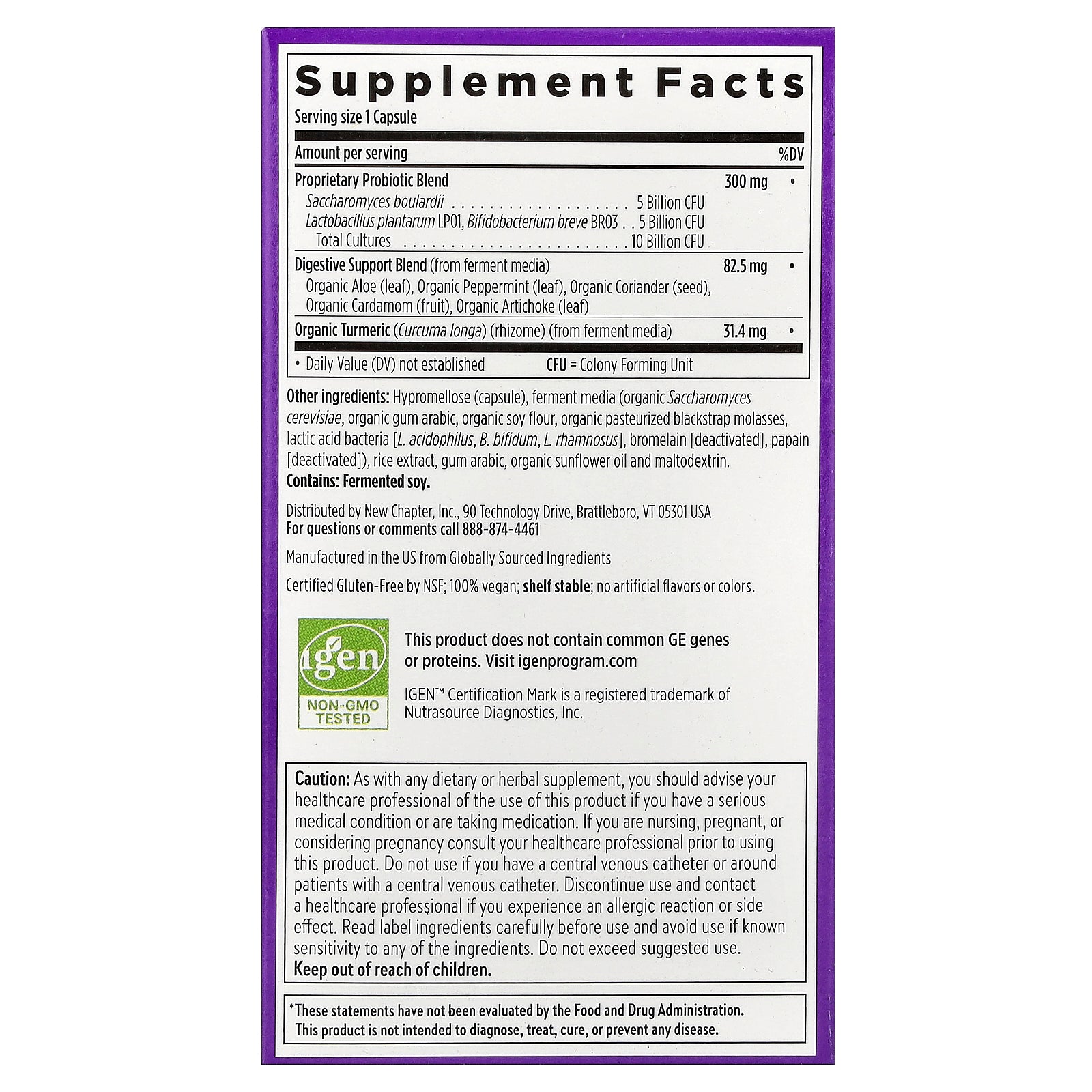 Hypromellose (capsule), ferment media (organic saccharomyces cerevisiae, organic gum acacia, organic soy flour, organic pasteurized blackstrap molasses, lactic acid bacteria [L.acidophilus, B. bifidum, L. rhamnosus], bromelain [deactivated], papain [deactivated]), rice extract, gum arabic, organic sunflower oil and maltodextrin.