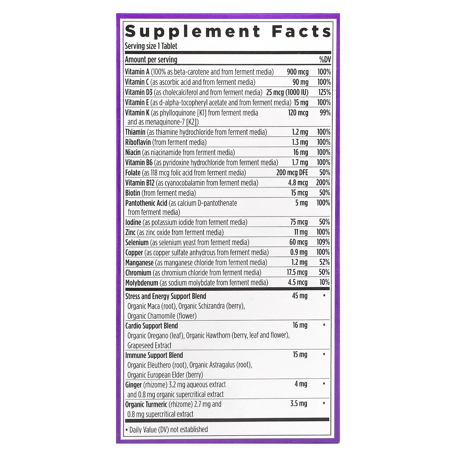 | Folate (as 118 mcg folic acid from ferment media) | 200 mcg DFE | 50% |