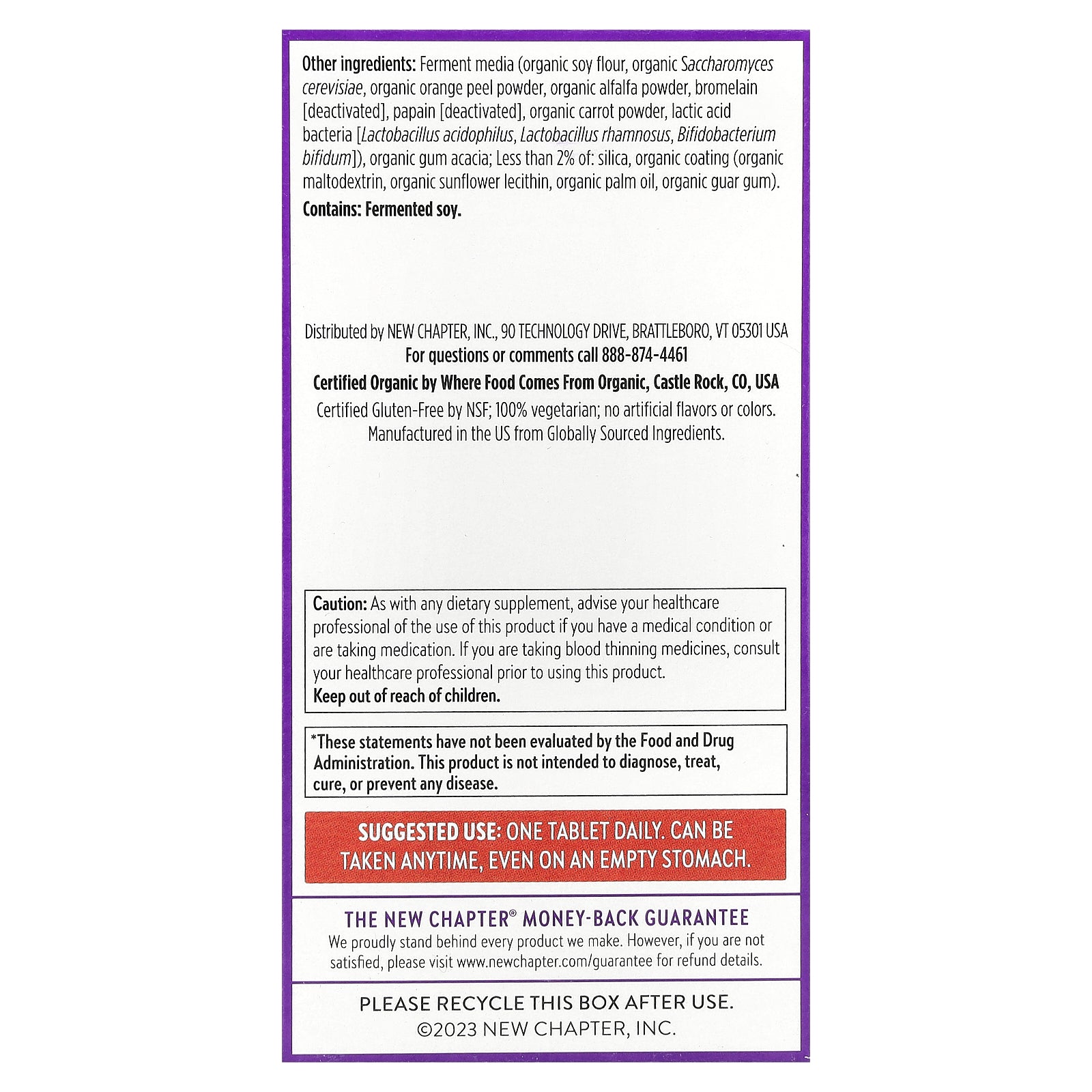 Ferment media (organic soy flour, organic saccharomyces cerevisiae, organic orange peel powder, organic alfalfa powder, bromelain [deactivated], papain [deactivated], organic carrot powder, lactic acid bacteria [lactobacillus acidophilus, lactobacillus rhamnosus, bifidobacterium bifidum]), organic gum acacia; less than 2% of: silica, organic coating (organic maltodextrin, organic sunflower lecithin, organic palm oil, organic guar gum).
