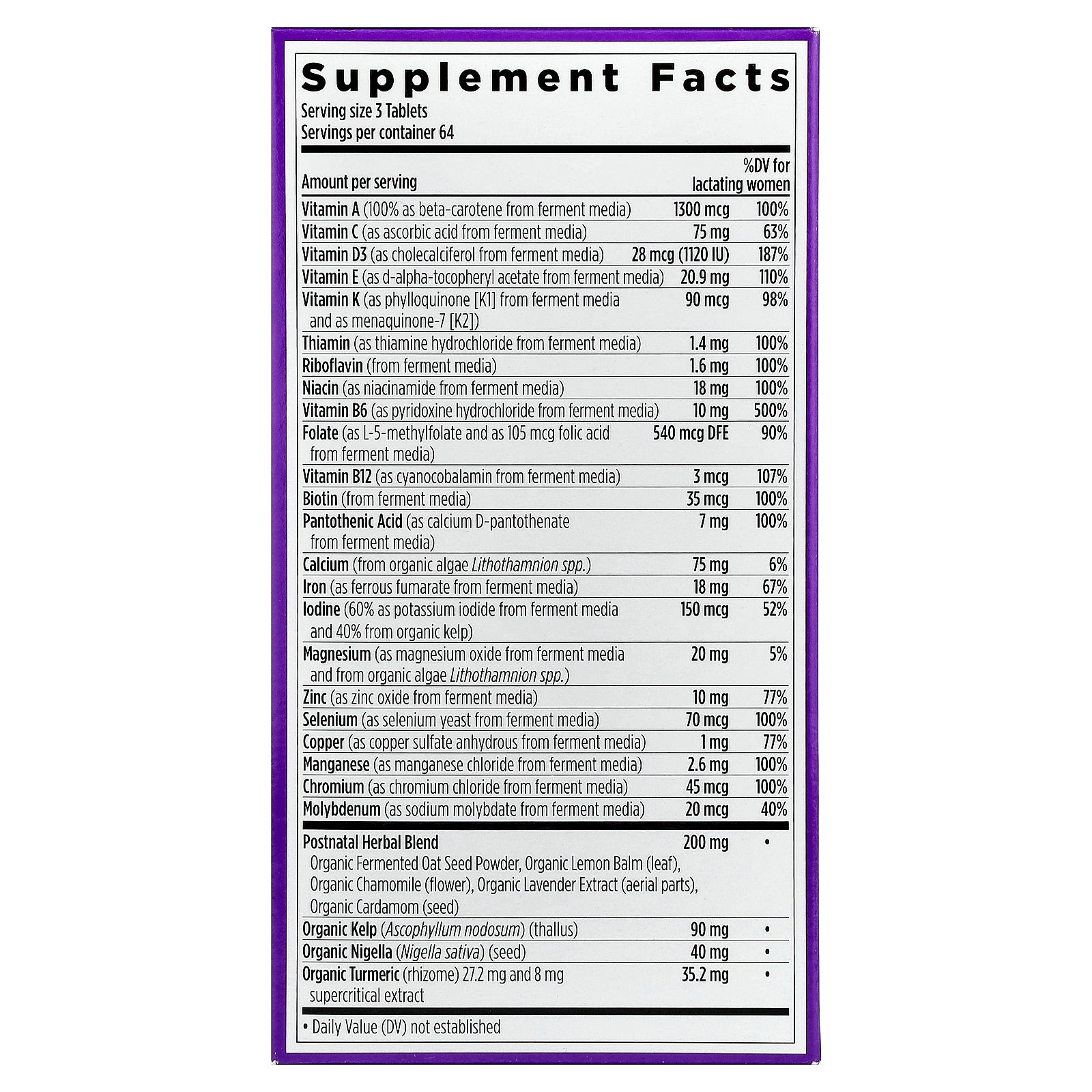 | Amount Per Serving | % DV for lactating women | |