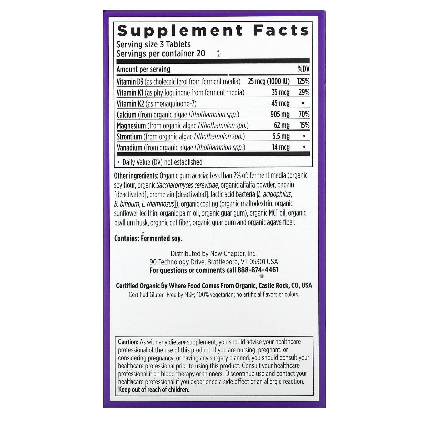 | Vitamin D3 (as cholecalciferol from ferment media) | 25 mcg (1000 IU) | 125% |