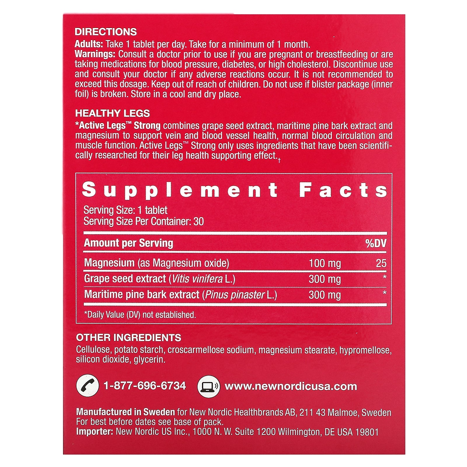 Active Legs™ Strong combines grape seed extract, maritime pine bark extract and magnesium to support vein and blood vessel health, normal blood circulation and muscle function. Active Legs™" Strong only uses ingredients that have been scientifically researched for their leg health supporting effect.